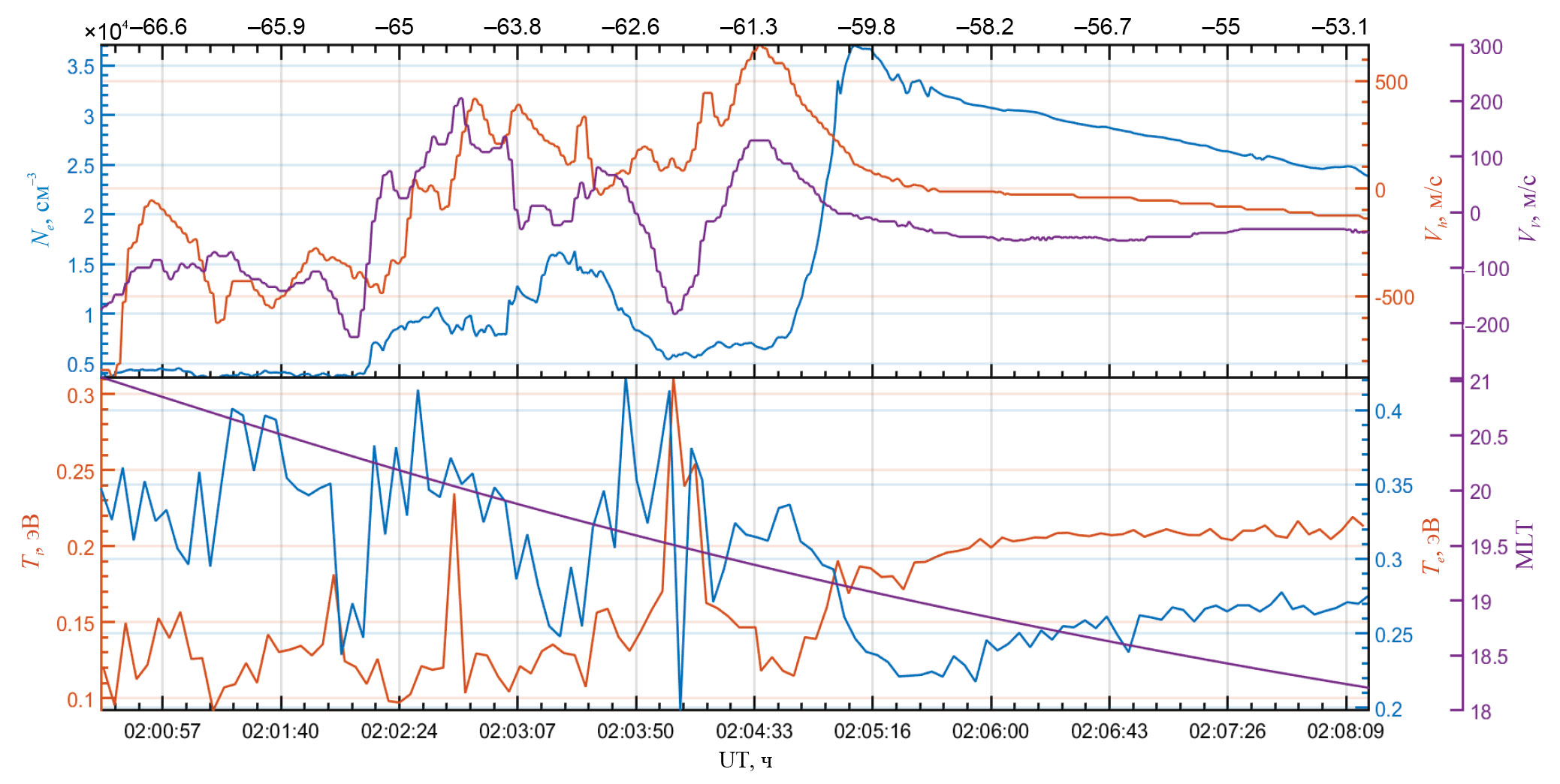 На рис. 2 представлены результаты измерений спутника DMSP F-16 во время геомагнитного события 14.03.2021. Как видно из верхней панели рисунка, на участке геомагнитных широт от –62.6° до –60.4° в секторе 19 MLT расположен провал электронной концентрации. Ближе к экваториальной стенке провала на геомагнитной широте –61.3° находится пик горизонтальной скорости дрейфа ионов (~600 м/с), пространственно совпадающий с пиком вертикальной скорости дрейфа ионов (~100 м/с). На нижней панели рисунка на широтах от –62.6° до –61.3° наблюдается рост температуры ионов до ~0.3 эВ и электронов до ~0.4 эВ. Интересен тот факт, что рост температуры электронов и ионов пространственно не совпадает с пиком вертикальной и горизонтальной скоростей дрейфа и расположен на ~0.6° широты полярнее. Это может быть связано со значительно более низкой пространственной частотой измерений температур ионов и электронов (~0.25 Гц), чем пространственная частота измерений скоростей дрейфа (2 Гц) на спутнике серии DMSP.