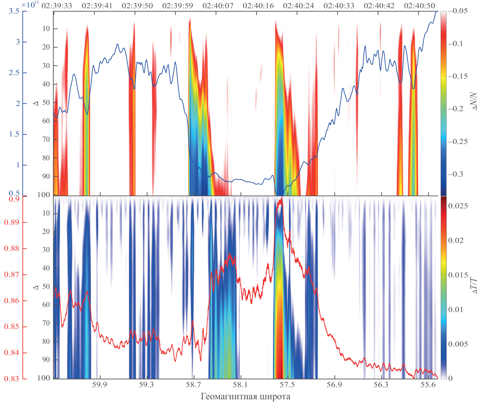 Рис. 4. Верхняя панель — изменение электронной концентрации (синяя линия) и параметра ΔN/N (цветовая шкала) от геомагнитной широты (дипольная модель, 110 км) (нижняя ось абсцисс) и времени UT (верхняя ось абсцисс) по данным спутника NorSat-1 на высоте ~600 км во время геомагнитного события 14.03.2021 в 02 UT; нижняя панель — изменение электронной температуры (красная линия) и параметра ΔT/T (цветовая шкала) по данным спутника NorSat-1