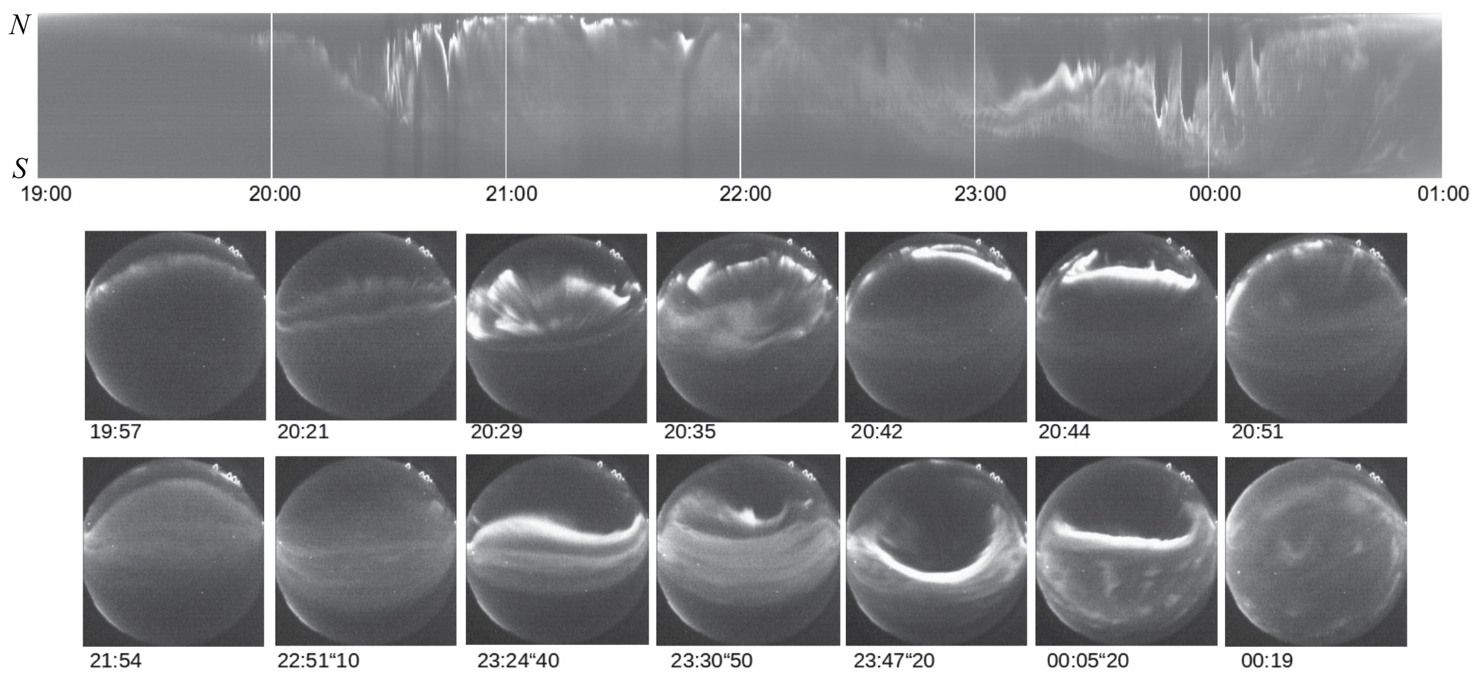 Рассмотрим случай c 12.09.2013 19:00 UT до 13.09.2013 01:00 UT. На рис. 1 приведена авроральная кеограмма, т. е. развитие во времени аврорального свечения атмосферы в сечении с севера на юг поля зрения камеры в Апатитах (67°34″ с.ш., 33°16″ в.д.), и полные изображения всего неба в отдельные моменты. Описание камеры в составе системы MAIN приведено в работе [9].