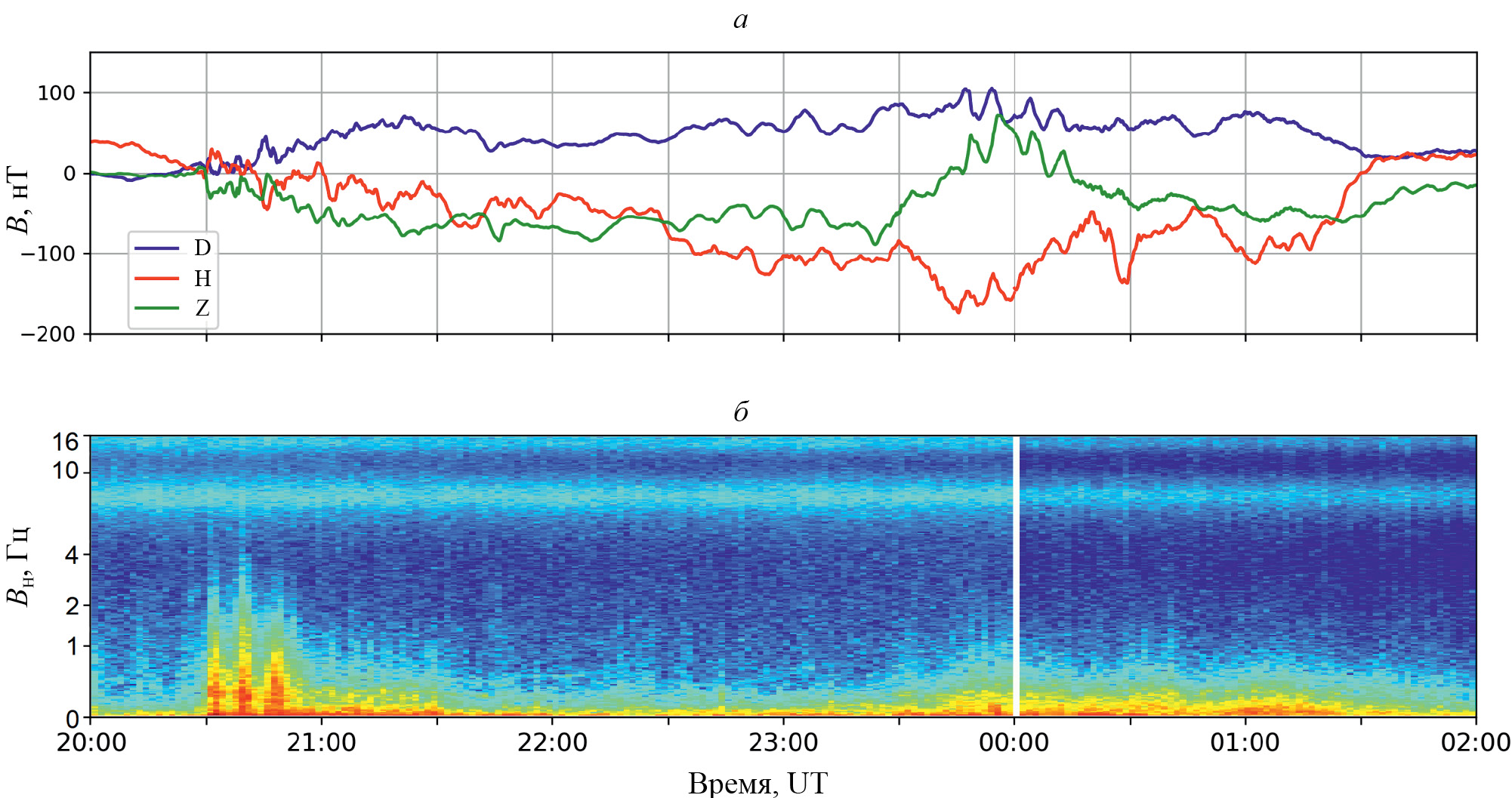 Рис. 2. Магнитные измерения 12—13.09.2013 в обсерватории ПГИ “Ловозеро”: три компоненты магнитного поля (а); КНЧ-пульсации в H-компоненте магнитного поля (б)