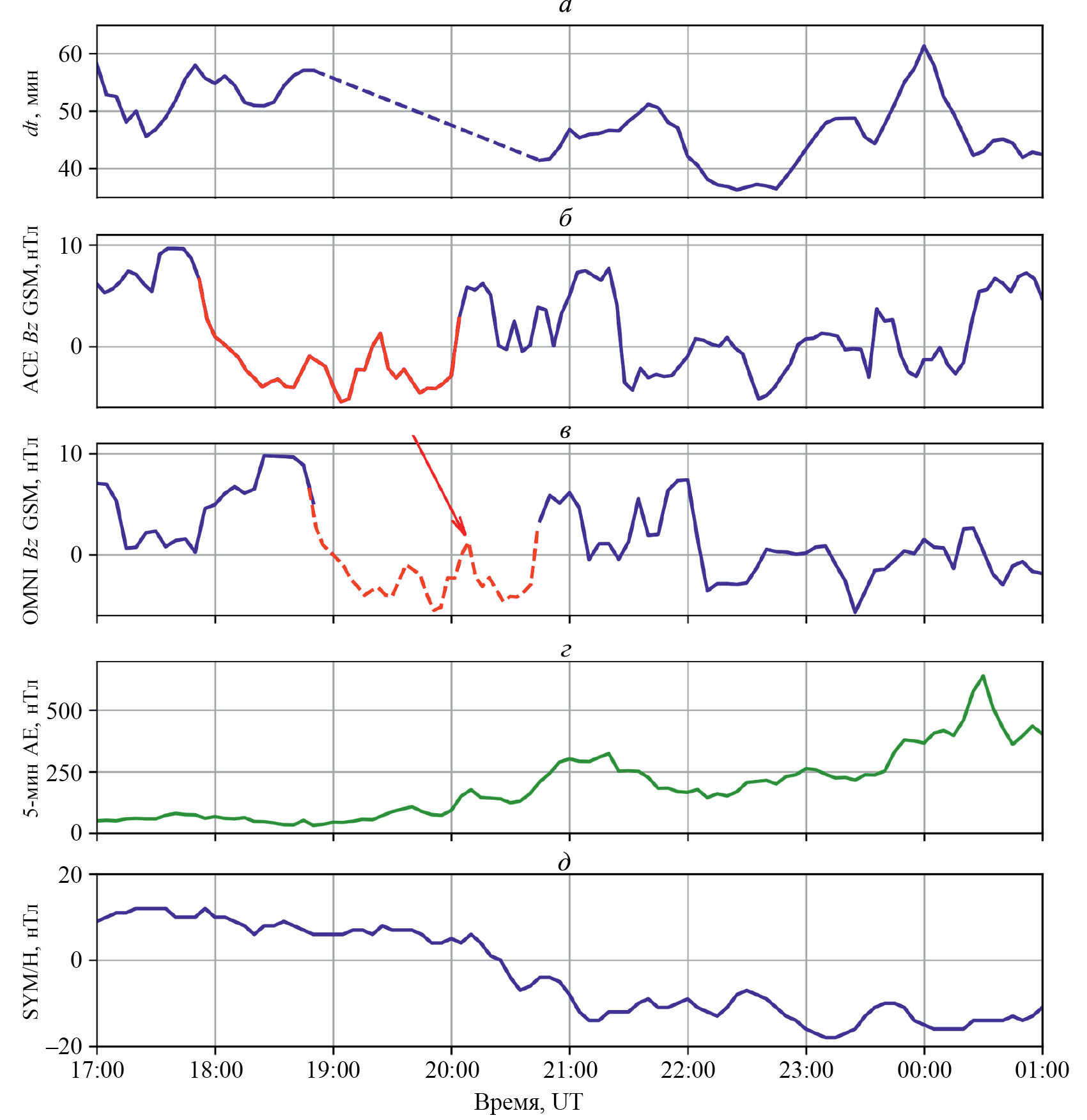 Рис. 3. Данные по межпланетному полю и индексы активности для 12—13.09.2013: задержка в данных со спутника ACE до подсолнечной точки магнитосферы (данные OMNI) (а); z-компонента межпланетного магнитного поля B в GSM-координатах, красным выделен участок пробела в данных OMNI (б); z-компонента межпланетного магнитного поля B в GSM-координатах в подсолнечной точке по данным OMNI, красным пунктиром показан участок, взатый из данных ACE (в); 5-минутный AE-индекс (г); SYM/H-индекс (д)