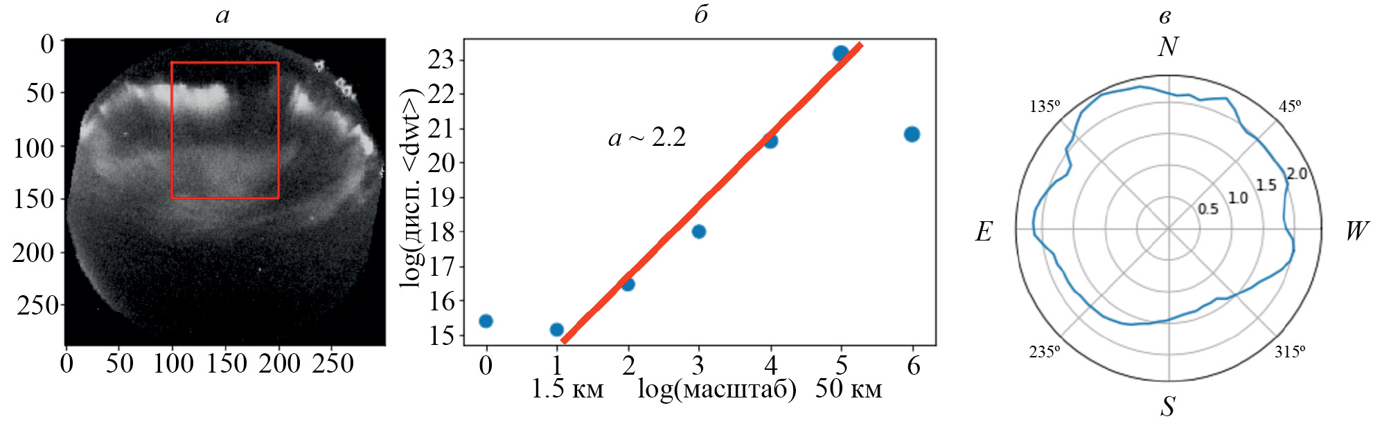 Рис. 4. Обработка изображения: кадр с камеры всего неба (а), красная рамка — выделение области на изображении с учетом ориентации; определение наклона (спектрального индекса) по логарифмическому графику дисперсии детализирующих коэффициентов от масштаба для выбранной области по методу из [11] в диапазоне масштабов 1.5—50 км (б); зависимость спектрального индекса от азимутального направления (ориентации маски) (в)