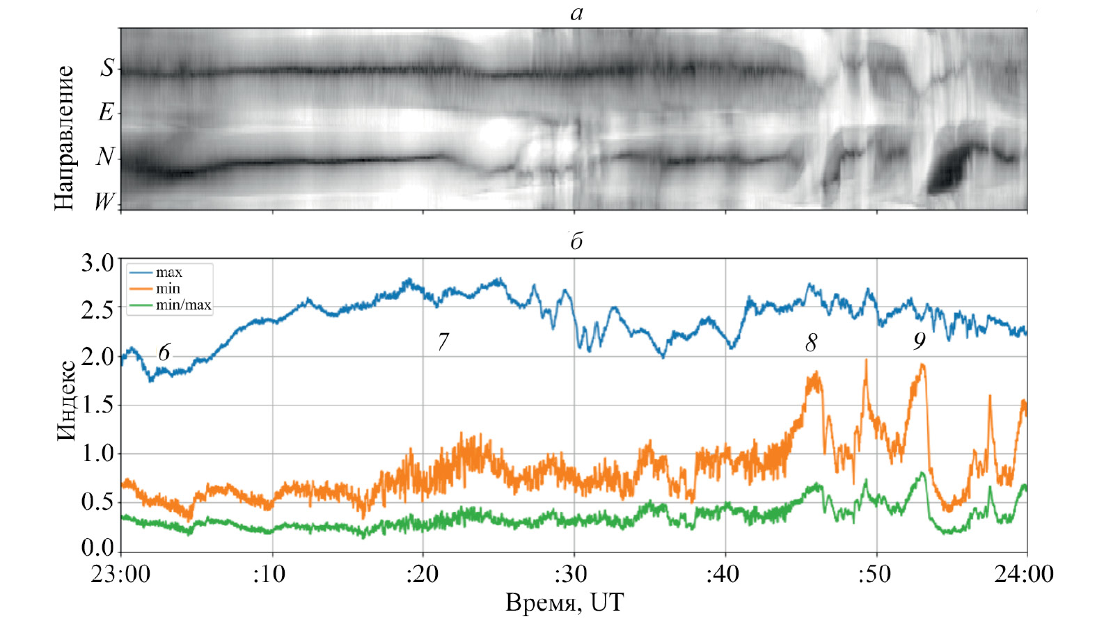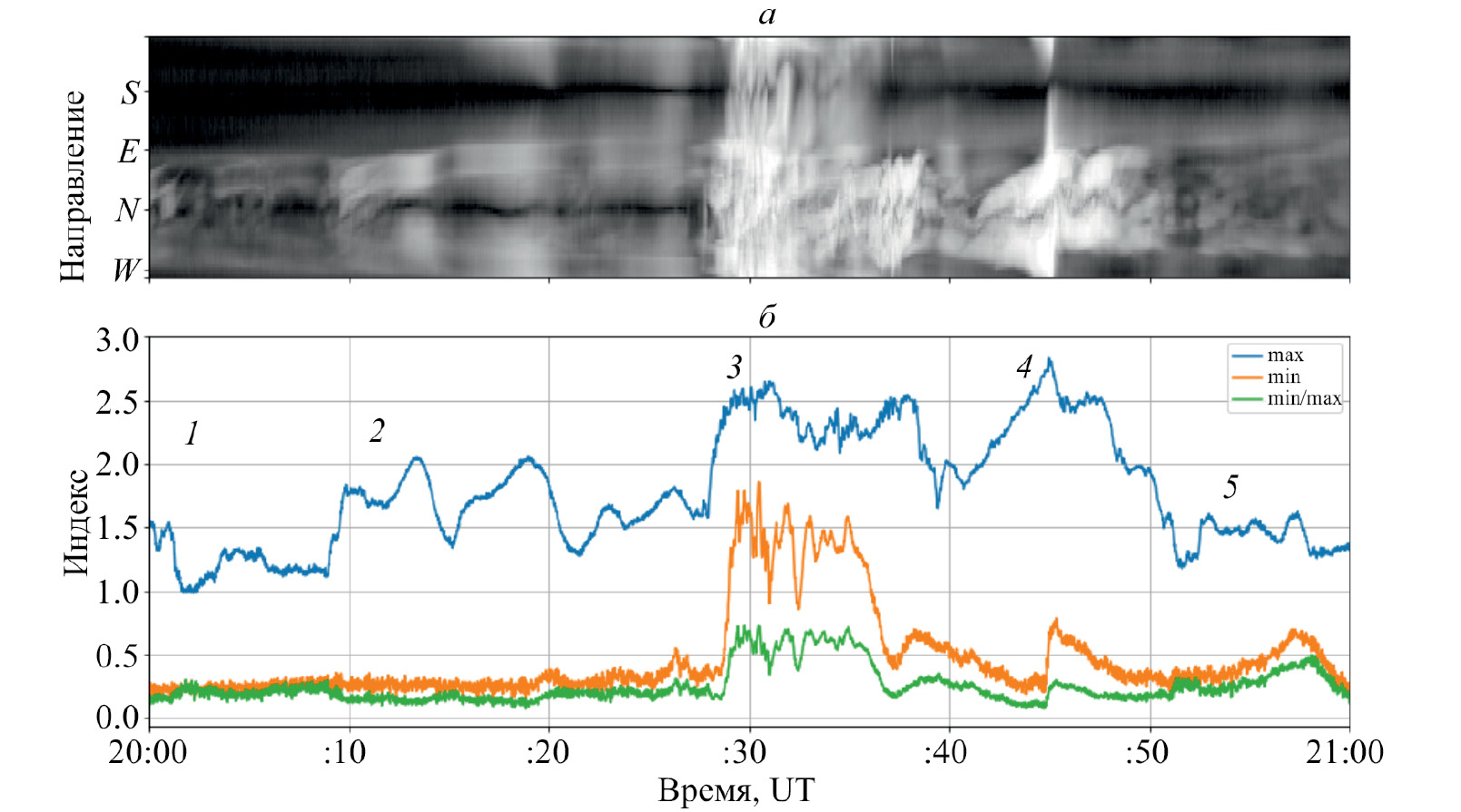 Рис. 5. Результаты обработки оптических данных для интервала 20:00—21:00 UT, 12.09.2013: зависимость спектрального индекса a в координатах “время — направление”, стороны света показаны на оси направления (а); зависимости max(a), min(a) и min(a)/max(a) от времени (б). Отдельные моменты отмечены точками 1—5, которые обсуждаются в тексте