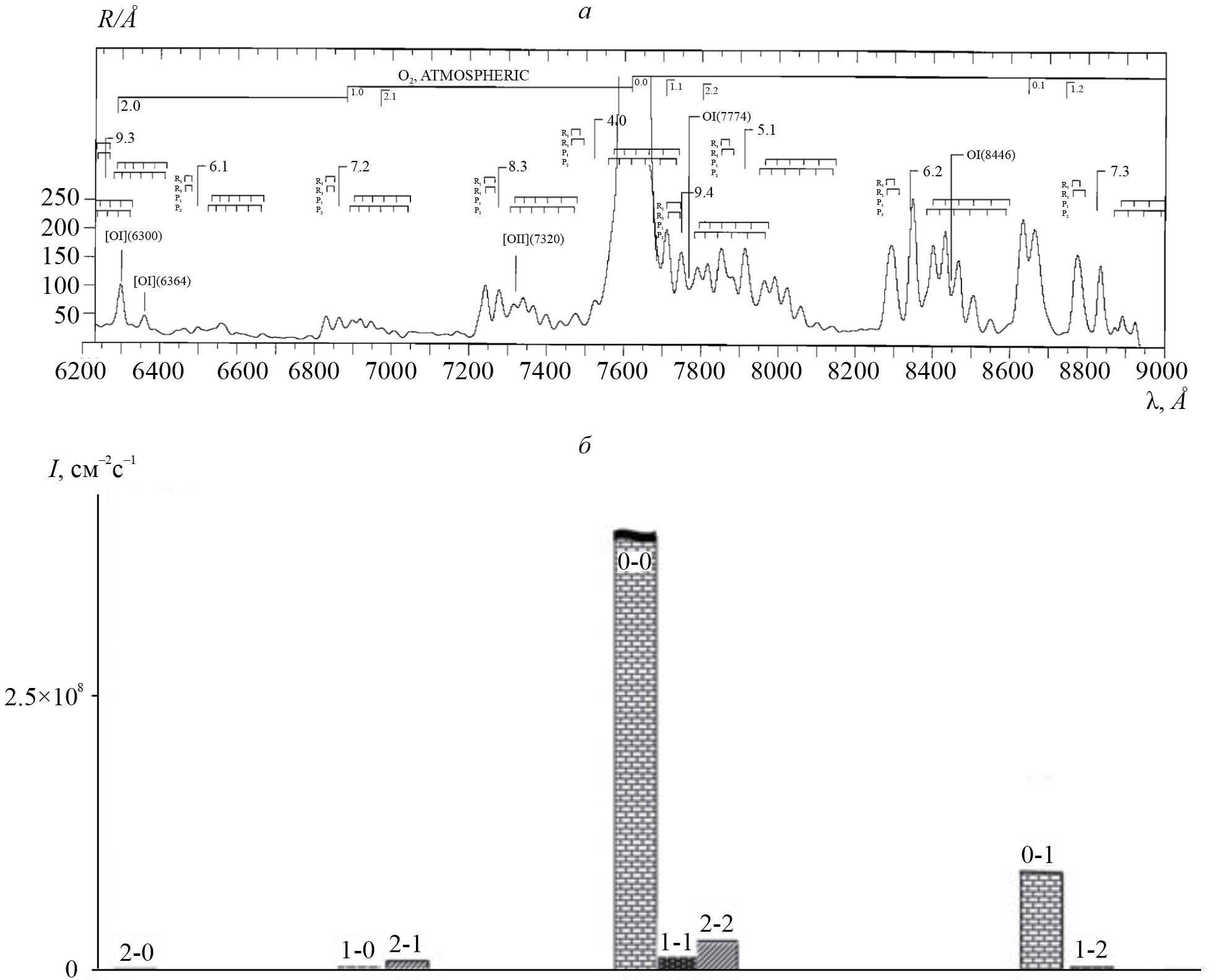 Рис. 1. Спектр свечения ночного неба в диапазоне 620—900 нм: данные с космического шаттла “Индевор” (STS-69) (а), рассчитанные значения интенсивности излучения О2* в Атмосферных полосах (гистограммы) в этом же диапазоне (б). Цифры над пиками — значения колебательных уровней (v'—vʺ) при излучательном переходе (3)