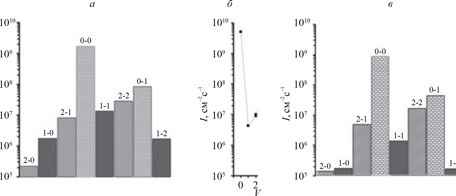 Кроме того, в настоящей работе рассчитаны значения общей интегральной светимости Ivʹvʺ (см–2с–1) Атмосферных полос в диапазоне 620—900 нм для экваториальной зоны и северных тропиков. В расчетах используются экспериментальные данные о характерных концентрациях [O] в области экватора и северных тропиков Земли, полученные с помощью зондирования атмосферы на спутнике термосферно-ионосферно-мезосферной энергетики и динамики (TIMED) с использованием оптического спектрографа инфракрасной микроскопической системы OSIRIS [14]. На рис. 2в приведены гистограммы рассчитанных интенсивностей полос, обусловленных спонтанными излучательными переходами с колебательных уровней vʹ = 0—2, для экваториальной зоны и северных тропиков.