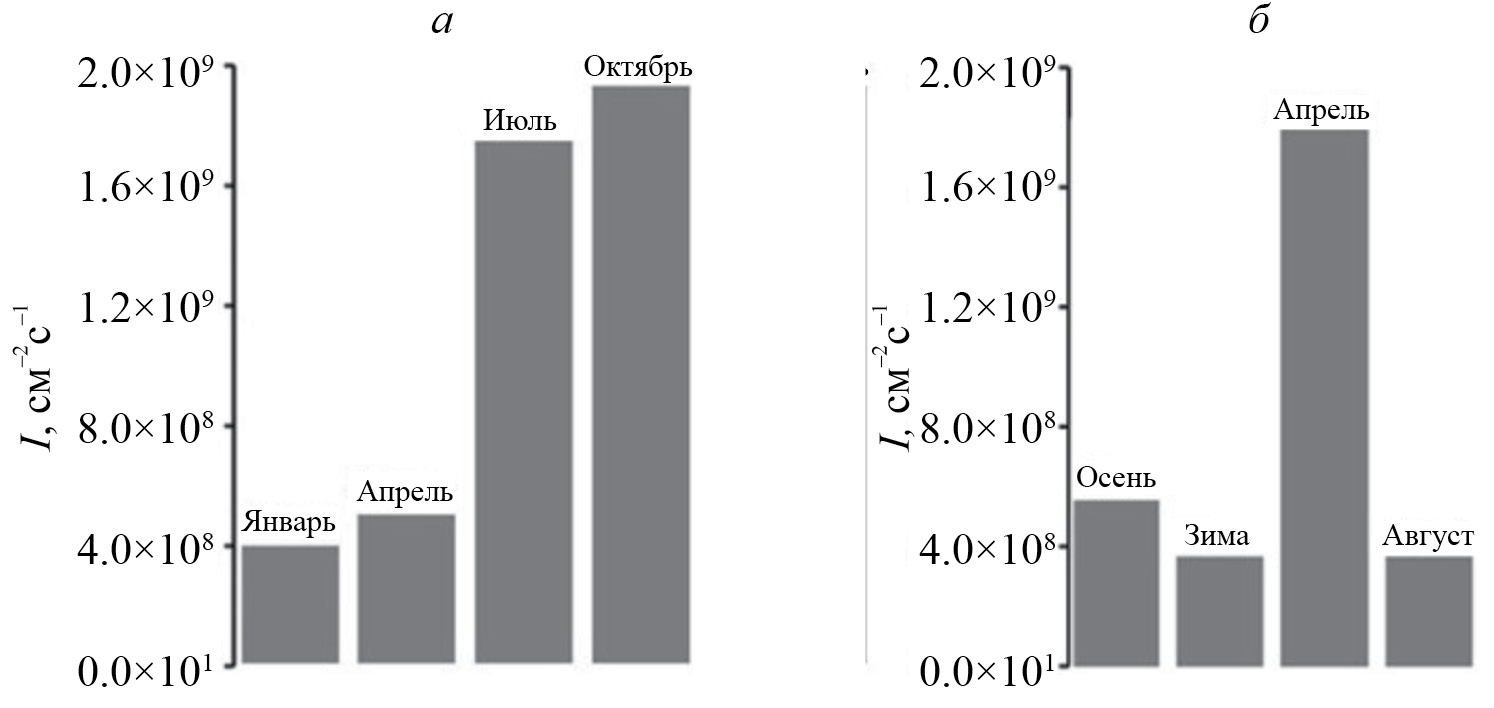 Рис. 3. Значения общей интегральной светимости I, см–2с–1, всей системы Атмосферных полос: для средних широт Земли (а), для экваториальной зоны, включая северные тропики (б)