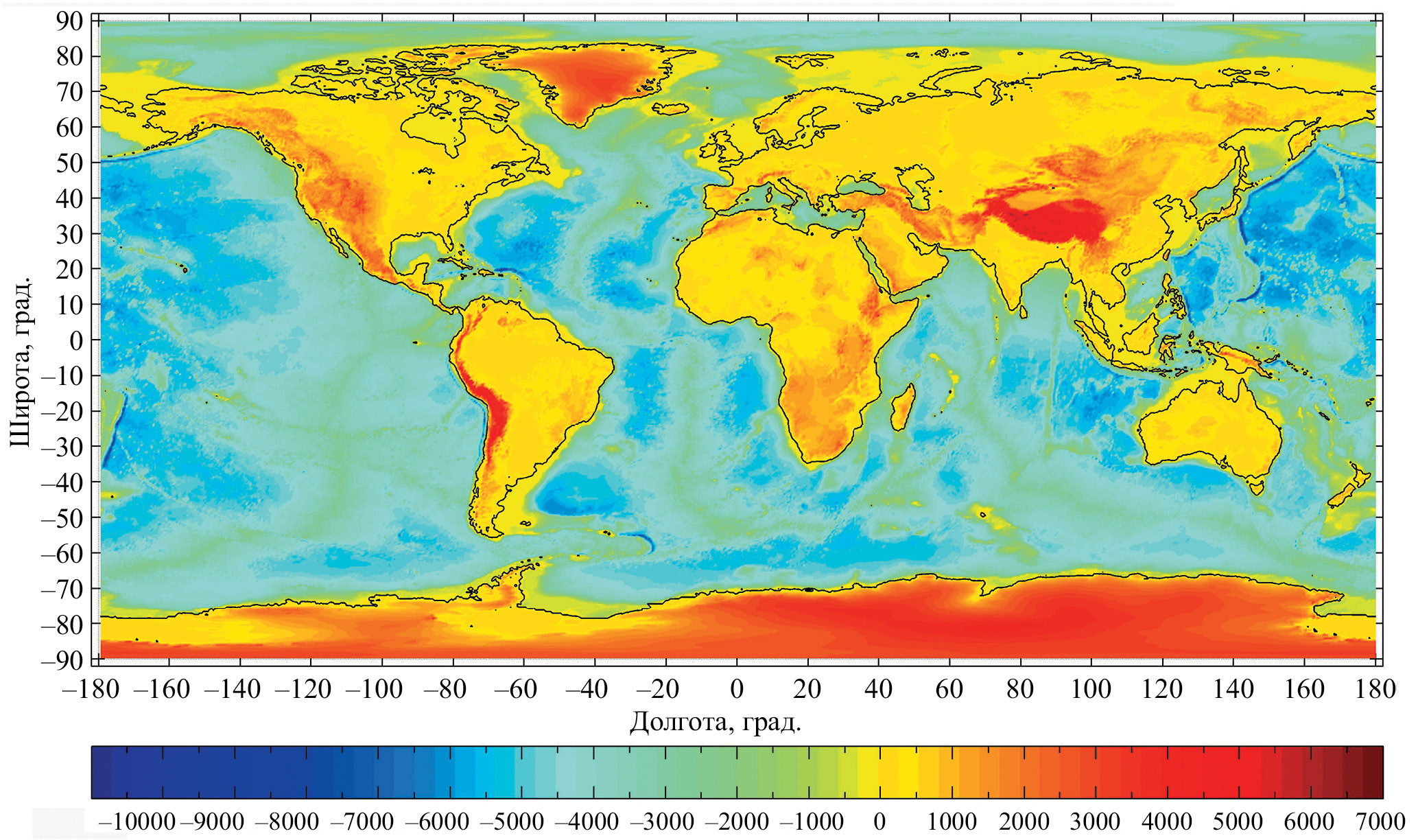 Используемый в модели рельеф земной поверхности показан на карте, приведенной на рис. 1. Можно отметить, что отрицательные значения на этом рисунке не учитываются в расчетах, поскольку атмосфера находится выше уровня океана.