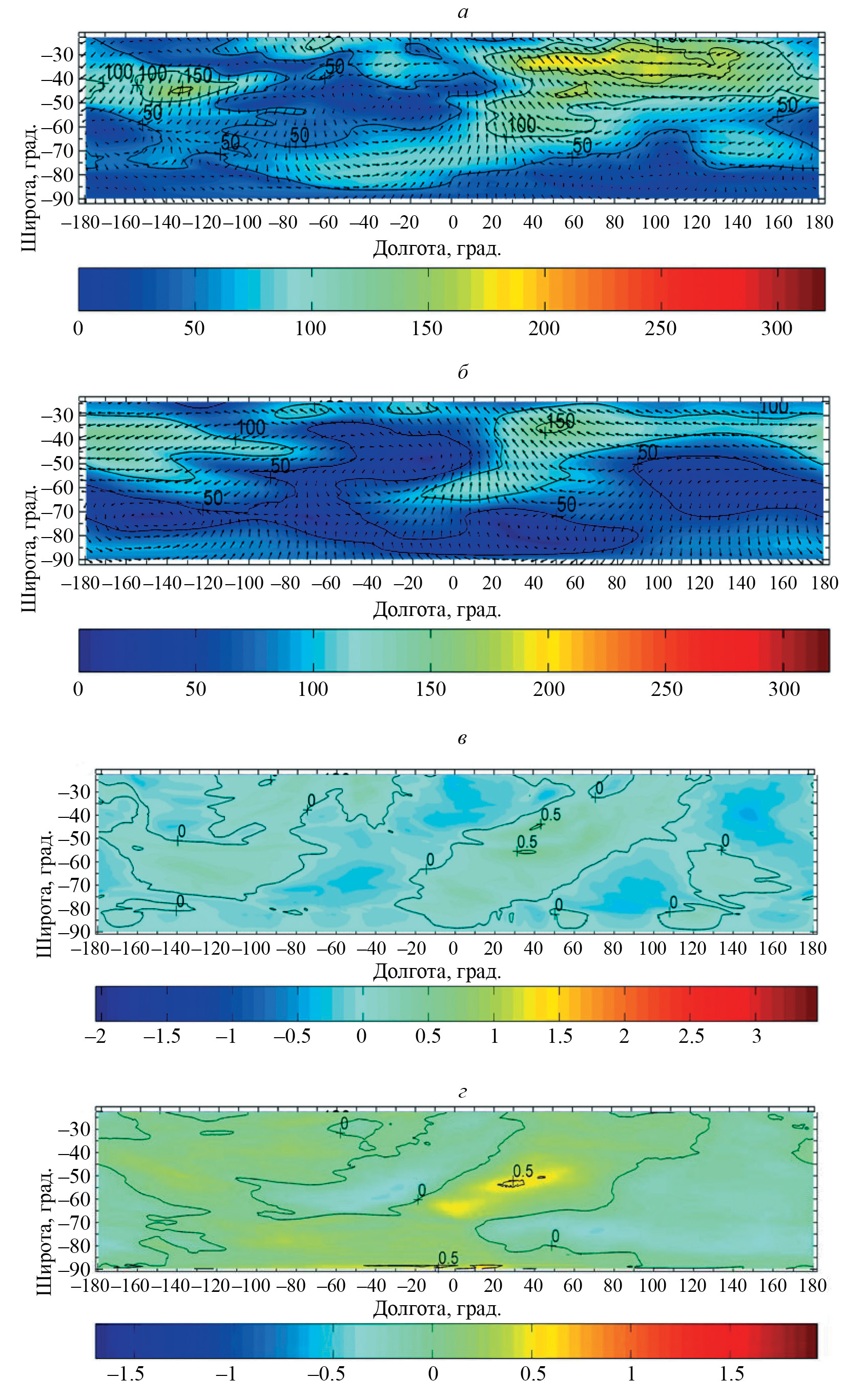 Видно, что результаты расчетов горизонтальной циркуляции атмосферы Южного полушария, полученные как с учетом рельефа, так и в приближении гладкой земной поверхности, на разных высотных уровнях нижней и средней атмосферы оказываются качественно похожими. Однако между ними обнаруживаются и определенные различия. Эти различия хорошо видны при сравнении панелей a и б на рис. 2 и 3.