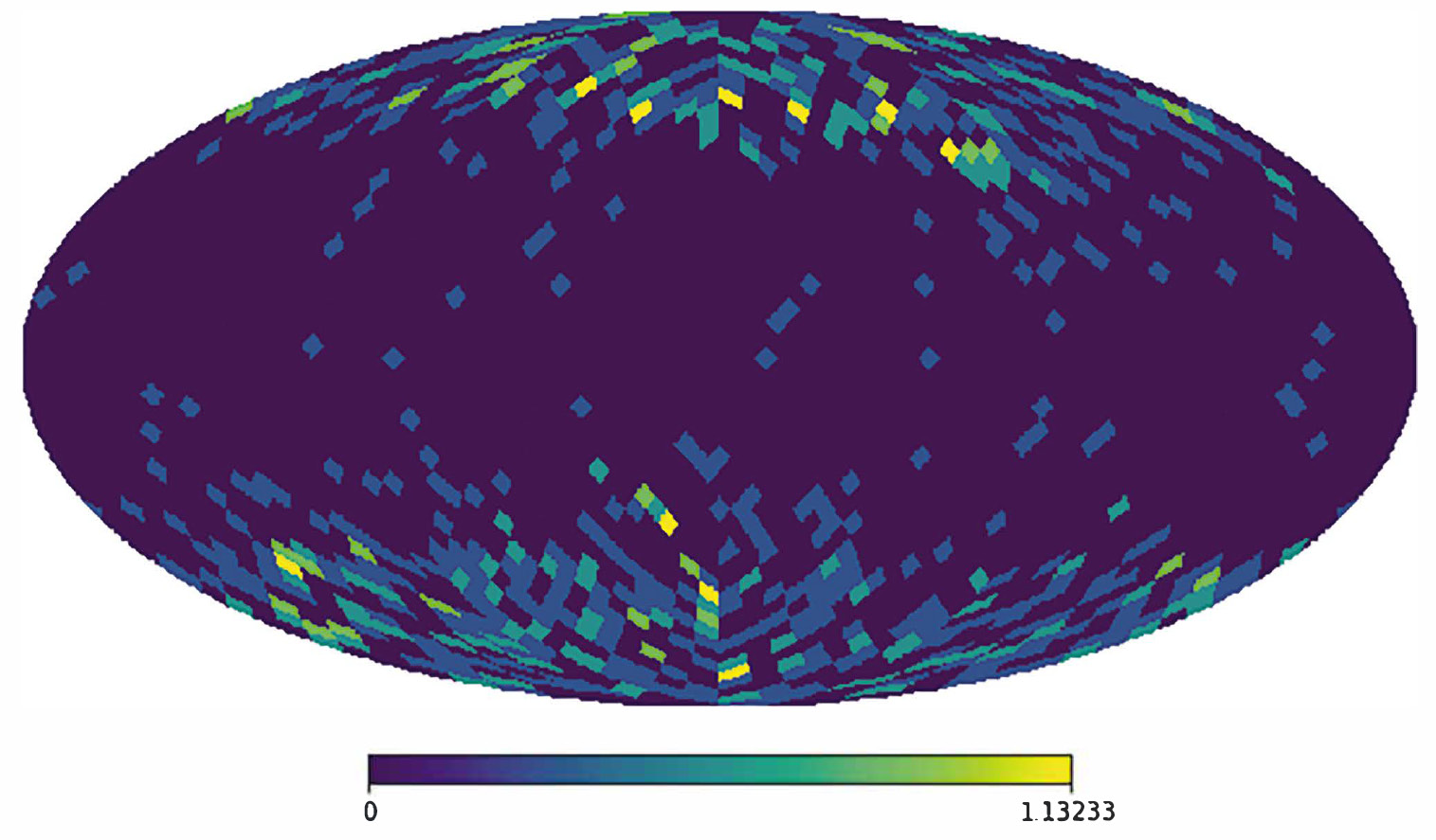 где N(p) — количество частиц, пересекающих данную сферу в области p; Npix — количество пикселов, на которые разбита карта; Nall — общее количество частиц, упавшее на данную сферу; p — порядковый номер пиксела из схемы пикселизации HEALPix [8].