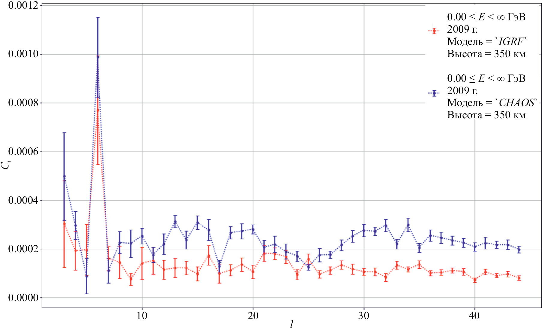 Как видно на рисунке, угловой спектр на высоких мультиполях (l > 7) для модели CHAOS в основном превышает угловой спектр IGRF. Это означает, что различие между моделями сказывается на траекториях частиц на малых масштабах (30° или 3500 км для измерений на высоте 350 км). Эти масштабы соответствуют частицам с энергиями от 1 ГэВ до 3—4 десятков ГэВ. Такой результат можно было ожидать, поскольку учет литосферного поля и главного поля высоких порядков мультипольного разложения в модели CHAOS приводит к учету мелкомасштабных структур.