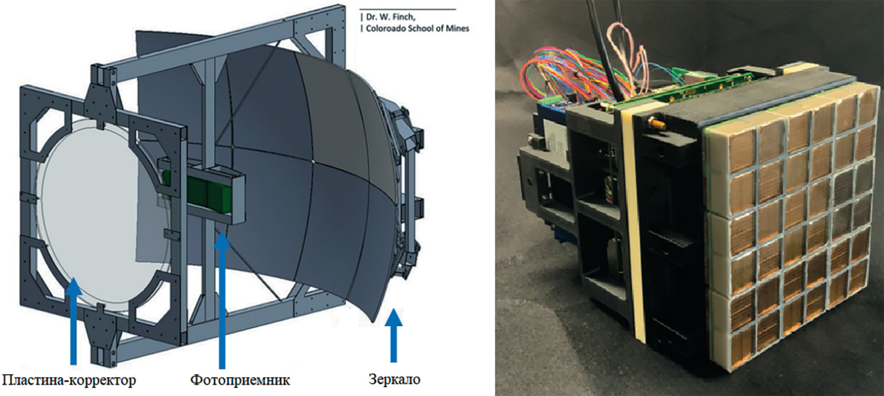 Рис. 1. Слева — схема флуоресцентного телескопа EUSO-SPB2, справа — фото модуля фотоприемника, состоящего из 36 МАФЭУ с общим числом каналов регистрации, равным 2304