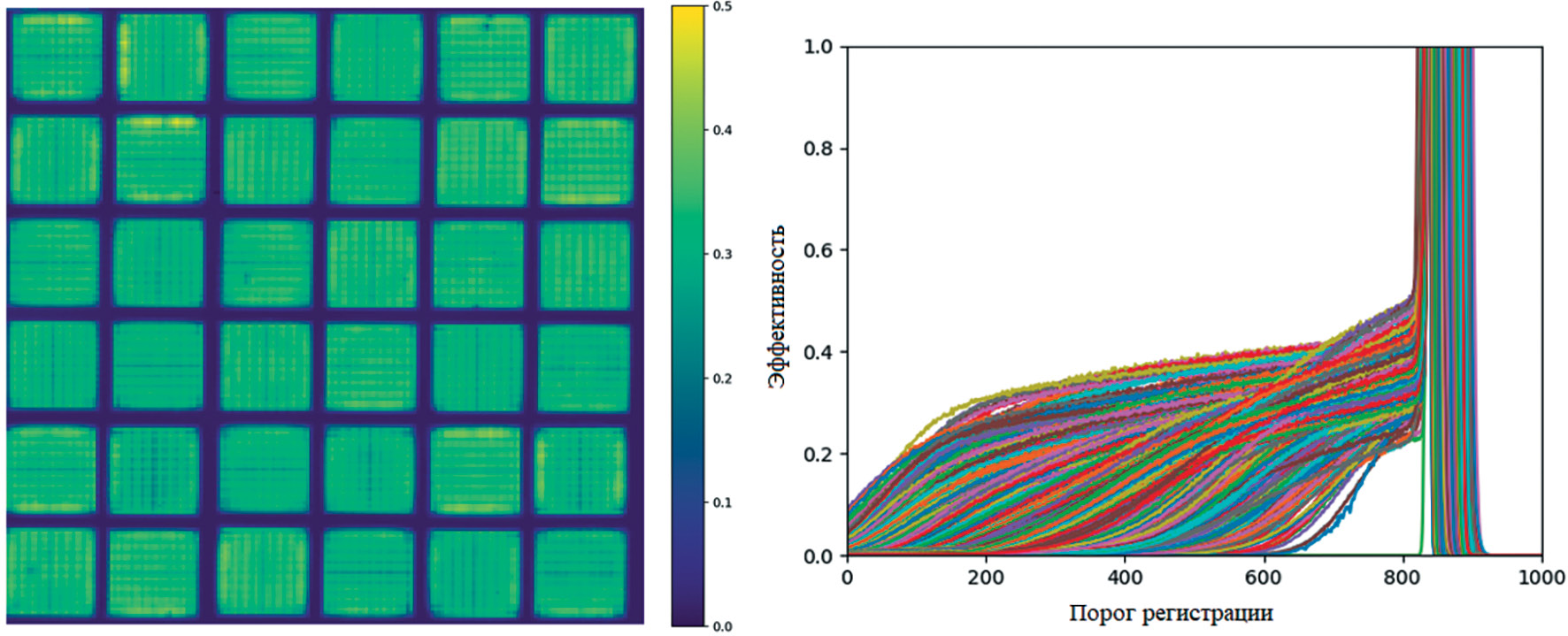 Рис. 2. Слева — результат сканирования матрицы модуля фотоприемника. Цветом отображены эффективности каждого пиксела. Темные области — границы между МАФЭУ. Разрешение сканирования — 200 × 200 точек на сторону фотоприемника (длина стороны 167 мм), длина волны светодиода — 375 нм. Справа — зависимость эффективности пиксела от порога дискриминатора (калибровочные кривые s-curve). Выставлены индивидуальные пороги, при которых эффективность детектирования при общем пороге 800 является максимальной