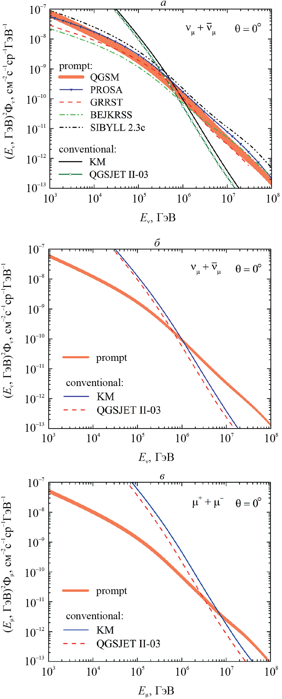 Дифференциальный спектр (D, Λс)-нейтрино для модели QGSM показан на рис. 1а (широкая полоса) вместе со спектрами (π, K)-нейтрино. Здесь же представлены спектры, рассчитанные другими авторами в рамках иных моделей рождения чарма: SIBYLL 2.3c [27], BEJKRSS [28], GRRST [29], PROSA [30, 31]. На рис. 1б и 1в показано сравнение вертикальных спектров (D, Λс)-лептонов в QGSM (узкая полоса) со спектрами (π,Κ)-лептонов. Кросс-энергия является полезной, но не единственной меткой, позволяющей на эксперименте обнаружить превышение сигнала над ожидаемым от атмосферных (π, K)-нейтрино. Кросс-энергия нейтрино с учетом полосы неопределенности: 550—675 ТэВ (QGSJET II-03) и 0.95—1.15 ПэВ (КМ). Для мюонов — 2.5—3.5 ПэВ (QGSJET II-03) и 6—8 ПэВ (КМ).