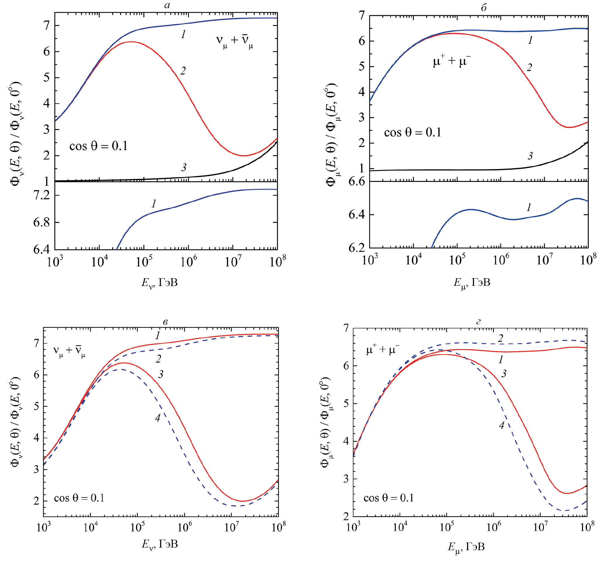 Рис. 2. Спектральное зенитно-угловое усиление дифференциальных потоков атмосферных нейтрино (а) и мюонов (б), рассчитанное для зенитного угла θ ≈ 84.26°: 1 — (π, K)-лептоны (КМ); 2 — суммарный спектр КМ + QGSM; 3 — (D, Λс)-лептоны (QGSM); панели внизу (а, б) — (π, K)-лептоны с лучшим разрешением, на которых видна немонотонность анизотропии, отражающая последовательное “включение” и насыщение доминирующих источников — от вкладов двухчастичных распадов заряженных пионов и каонов, к трехчастичным полулептонным распадам заряженных и нейтральных каонов. Это приводит к широкому распределению с “горбами”; 2-й горб (мюоны) как раз отвечает редкому Гi/Г ≃ 4 × 10–4) полулептонному распаду короткоживущего нейтрального каона KS (время жизни 0.9 × 10–10 с). Влияние модели адронного каскада на спектральное зенитно-угловое усиление потоков атмосферных нейтрино (в) и мюонов (г): 1 — (π, K)-лептоны для модели КМ; 2 — (π, K)-лептоны для модели QGSJET II-03; 3 — суммарный спектр КМ + QGSM; 4 — то же, что и 3, но для модели QGSJET II-03 + QGSM