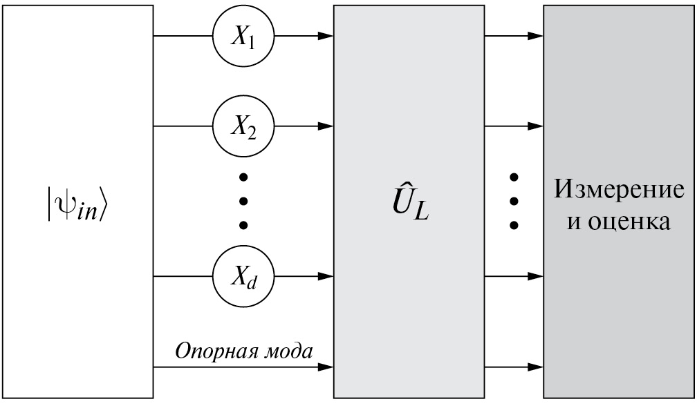 Рассмотрим процедуру измерения и оценки d неизвестных фазовых параметров χj (см. рис. 1а), выполняемую на основе пробного n-модового (n = d + 1) запутанного по пространству NооN-состояния, которое имеет следующий вид: