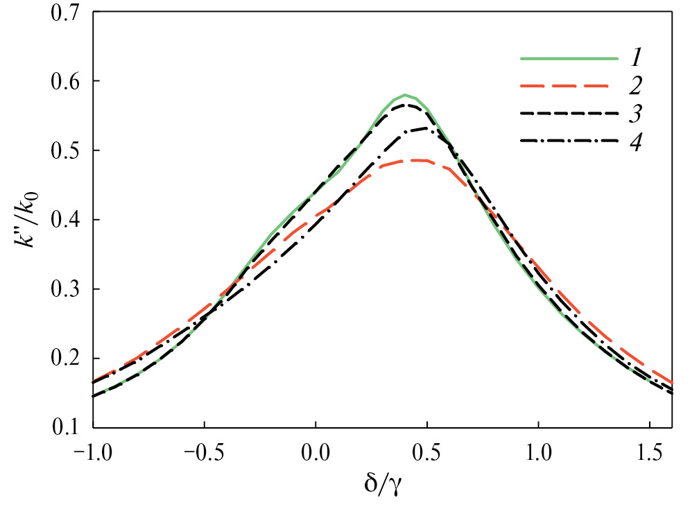 На рис. 1 показана спектральная зависимость мнимой части волнового числа света в среде k''(ω). Коэффициент поглощения нормирован на величину волнового числа резонансного излучения в вакууме k0. Расчет проведен для ансамблей с атомной плотностью . Кривые 1 и 2 получены в модельном расчете, 3 и 4 — при явном учете движения атомов. Двум парам кривых — 1 и 3, и 2 и 4 — соответствуют две температуры ансамбля. Поскольку характер влияния движения определяется соотношением доплеровского и естественного уширения, вместо температур ансамбля на графиках мы будем указывать величину характерного доплеровского сдвига k0v0. Так, кривые 1 и 3 получены для k0v0 = 0.1γ, кривые 2 и 4 — для k0v0 = 0.5γ.