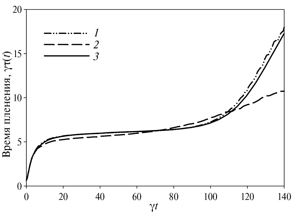 Рис. 2. Динамика мгновенного времени задержки флуоресценции для ансамбля атомов при k0v0 = 0.05, рассчитанная при моделировании движения доплеровскими сдвигами (1) и учете смещения атомов с течением времени (2). Для сравнения показана кривая 3, соответствующая неподвижным атомам