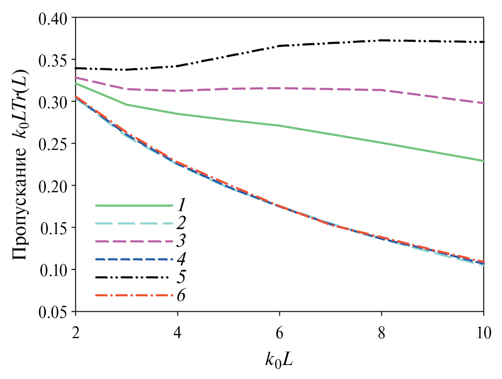 На рис. 4 показана зависимость усредненного коэффициента полного пропускания атомного ансамбля Tr от его толщины k0L при различных температурах. Расчет проведен для k0Lt = 50. Плотность атомов . Величина зеемановского расщепления, вызванного внешним постоянным магнитным полем Δ = 100γ. Отстройка частоты излучения от частоты перехода в свободном атоме δ равна 0.5γ. Для удобства интерпретации результатов приведен коэффициент пропускания, умноженный на толщину ансамбля k0LTr. Пары кривых 1 и 2, 3 и 4, 5 и 6 получены для k0v0 = 0.01γ, k0v0 = 0.025γ и k0v0 = 0.05γ соответственно.