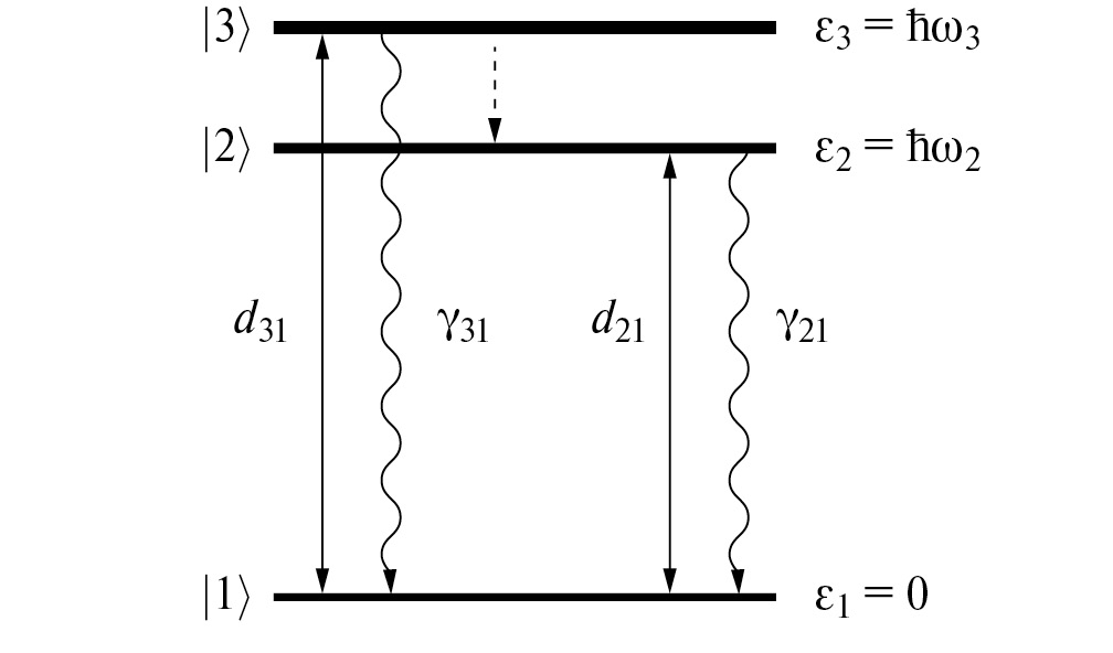 Оптические переходы разрешены только между верхними состояниями дублета |3> и |2> и нижним состоянием |1> (V-схема оптических переходов). Эти переходы (сплошные стрелки) характеризуются векторами дипольных моментов переходов d31 и d21, которые параллельны друг другу, а значения их вещественны, так что d31 = µd21 ≡ µd. Верхние дублетные состояния |3> и |2> спонтанно затухают (волнистые стрелки) в основное состояние |1> со скоростями γ31 и γ21 соответственно, которые подчиняются соотношению γ21 = μ2γ31. Предполагается, что частота дублетного расщепления ω32 мала по сравнению с частотами оптического перехода ω31 = ω3 –ω1 и ω21 = ω2 –ω1. На монослой падает нормально поляризованная вдоль дипольных моментов переходов плоская волна с частотой ω0, квазирезонансная оптическим переходам в V-квантовых излучателях. Безызлучательная релаксация в дублете задана константой γ32 и на графике показана пунктирной стрелкой.