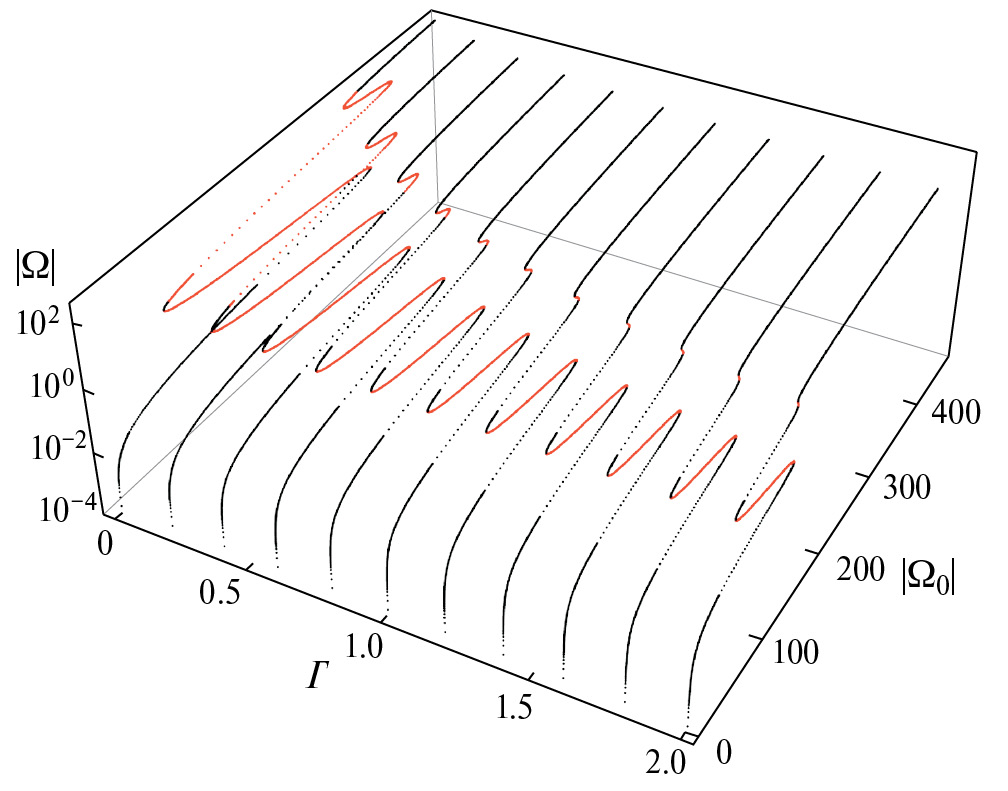 Очень важное значение имеет исследование стационарных режимов динамических систем. Анализ стационарного режима представленного в виде графика зависимости полного поля |Ω(t)| от падающего поля |Ω0| позволяет оценить проявление мультистабильности, соответственно оптического гистерезиса, устойчивость и неустойчивость и возможные сценарии поведения динамической системы. Стационарные уравнения можно получить из системы уравнений (1), полагая в них нулю производные по времени. Отметим, что стационарность решения не означает его устойчивость, стационарное решение может быть как устойчивым, так и неустойчивым. Стационарные решения рассматриваемой задачи (ρ˙αβ = 0, α, β = 1, 2, 3) с учетом фазовой релаксации Г находятся из следующей системы нелинейных алгебраических уравнений: