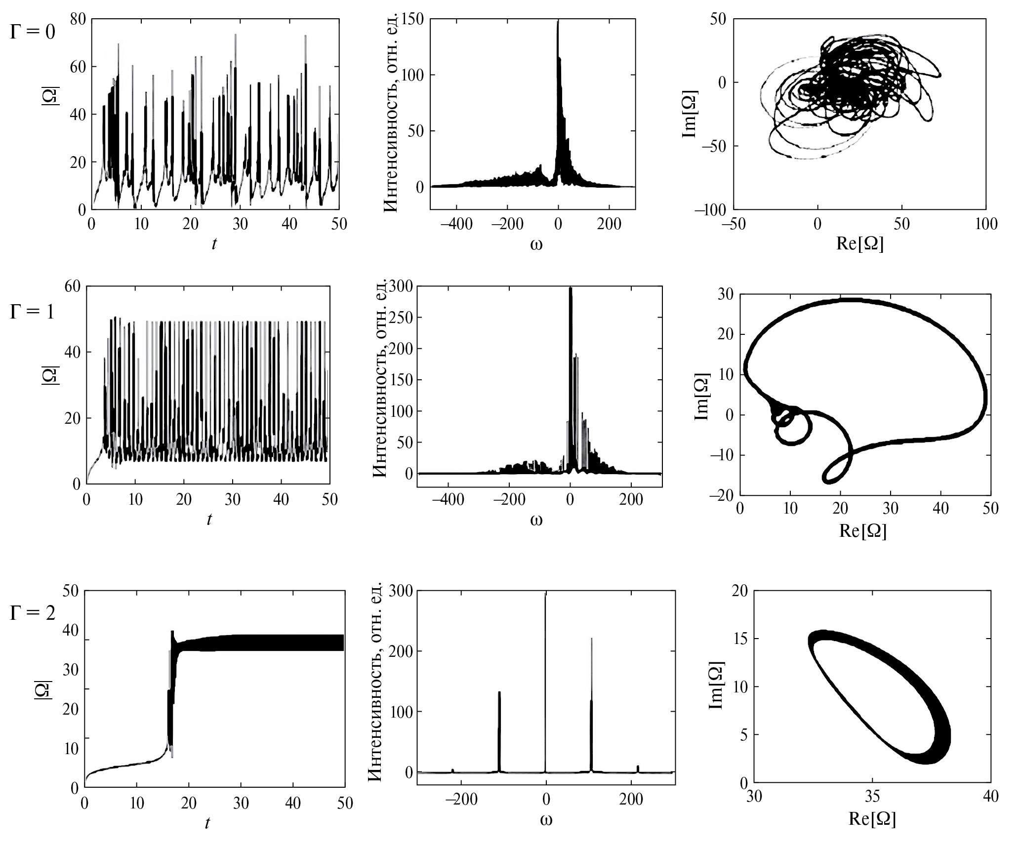 В отсутствие фазовой релаксации (верхний ряд) динамика отклика представляет нерегулярные осциляции поля, их спектры представляют собой непрерывный набор частот излучения, фазовая траектория в диаграмме хаотична. Мы наблюдаем хаотичный режим излучения. Фазовая релаксация регуляризует колебания поля (средний ряд), динамическая система переходит в аттрактор режима периодических осцилляций, с дискретным множеством эквидистантных наборов частоты излучения. При дальнейшем увеличении фазовой релаксации амплитуда периодических колебаний аттрактора и набор частот излучения убывает, а расстояние между частотами излучения (эквидистантность) увеличивается (нижний ряд). При увеличении дефазировки электронных состояний Г происходит изменение режима движения системы от хаотического к предельному циклу, т. е. система испытывает бифуркацию. «хаос — предельный цикл».