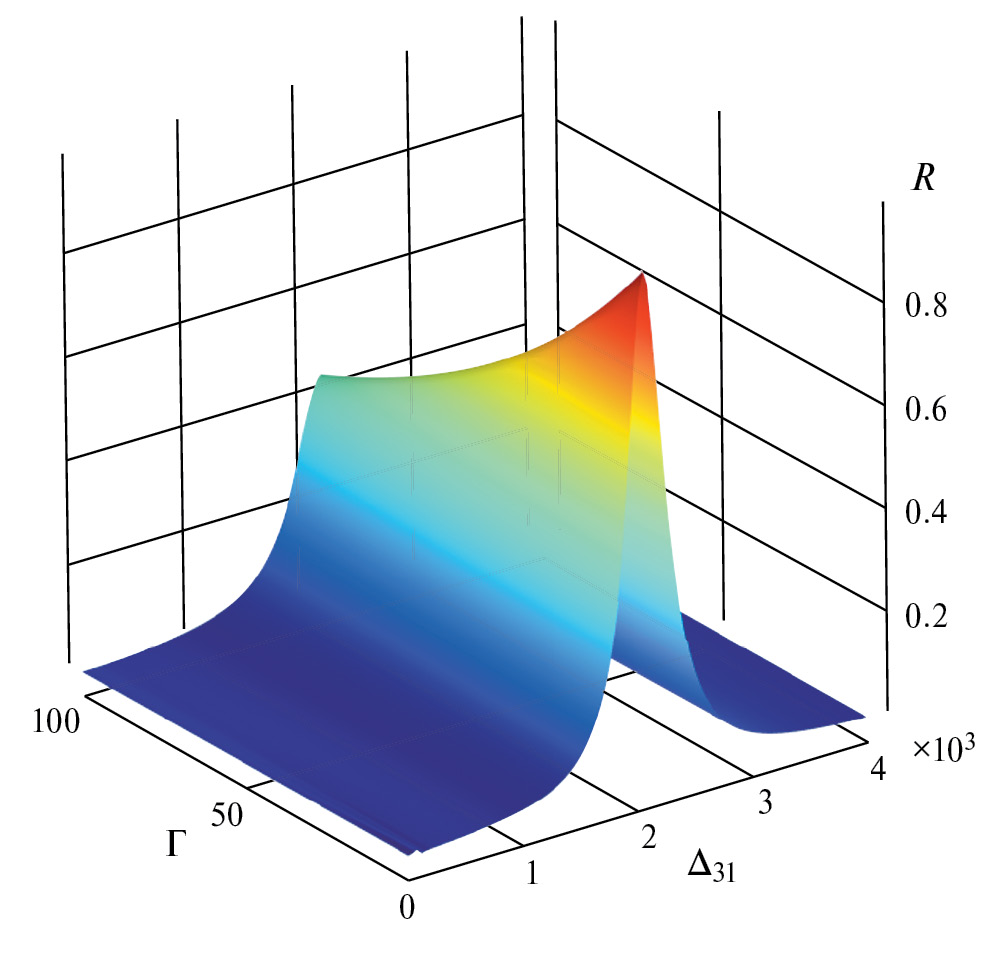 На рис. 4 приведен график зависимости коэфициента отражения с учетом дефазировки состояний (для слабого внешнего поля) как функция отстройки от резонанса Δ31. Виден пик отражения (R ≈ 1) в области Δ31 ≈ 2ΔL).