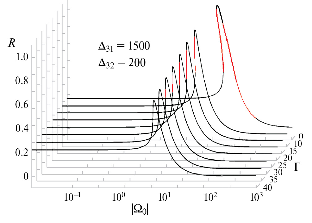 На рис. 5 представлены графики зависимости коэффициента нелинейного отражения R от величины входного поля при различных значениях дефазировки (фазовой релаксации) энергетических состояний вблизи истинного резонанса, которая учитывается величиной отстройки. Более того, в некотором диапазоне изменения Δ31 коэффициент отражения R является трехзначной функцией |Ω0|, что означает бистабильность.