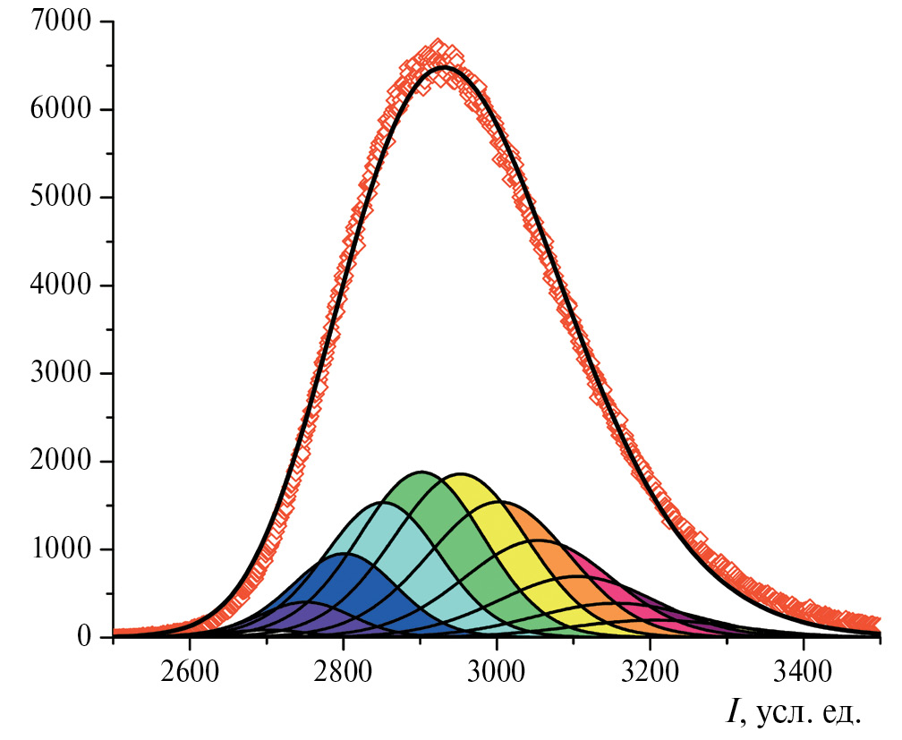где A — пуассоновское среднее числа фотоимпульсов, а в фигурных скобках стоит свертка гауссовой функции, соответствующей регистрации n одиночных фотоимпульсов, с функцией B(I), описывающей распределение темновых шумов ФЭУ. Распределение темновых шумов B(I) соответствует распределению на рис. 2б при нулевой мощности лазера накачки. Оказалось, что эта функция хорошо аппроксимируется суммой двух гауссиан: