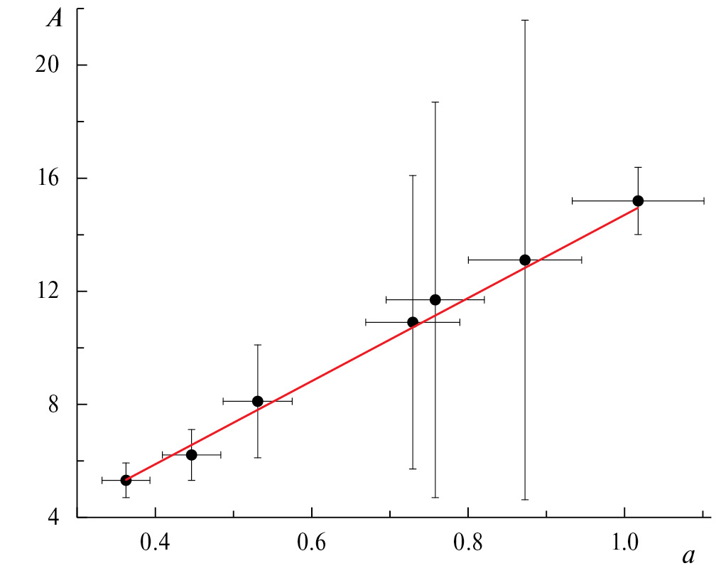 Рис. 4. Зависимость числа A одиночных фотоотсчетов ФЭУ, полученных из аппроксимации распределений значений фототока формулой (4), от числа a фотонов, падающих на ФЭУ, полученного путем измерения нормированной корреляционной функции рассеянного излучения (точки), и результат ее аппроксимации линейной зависимостью (сплошная линия)