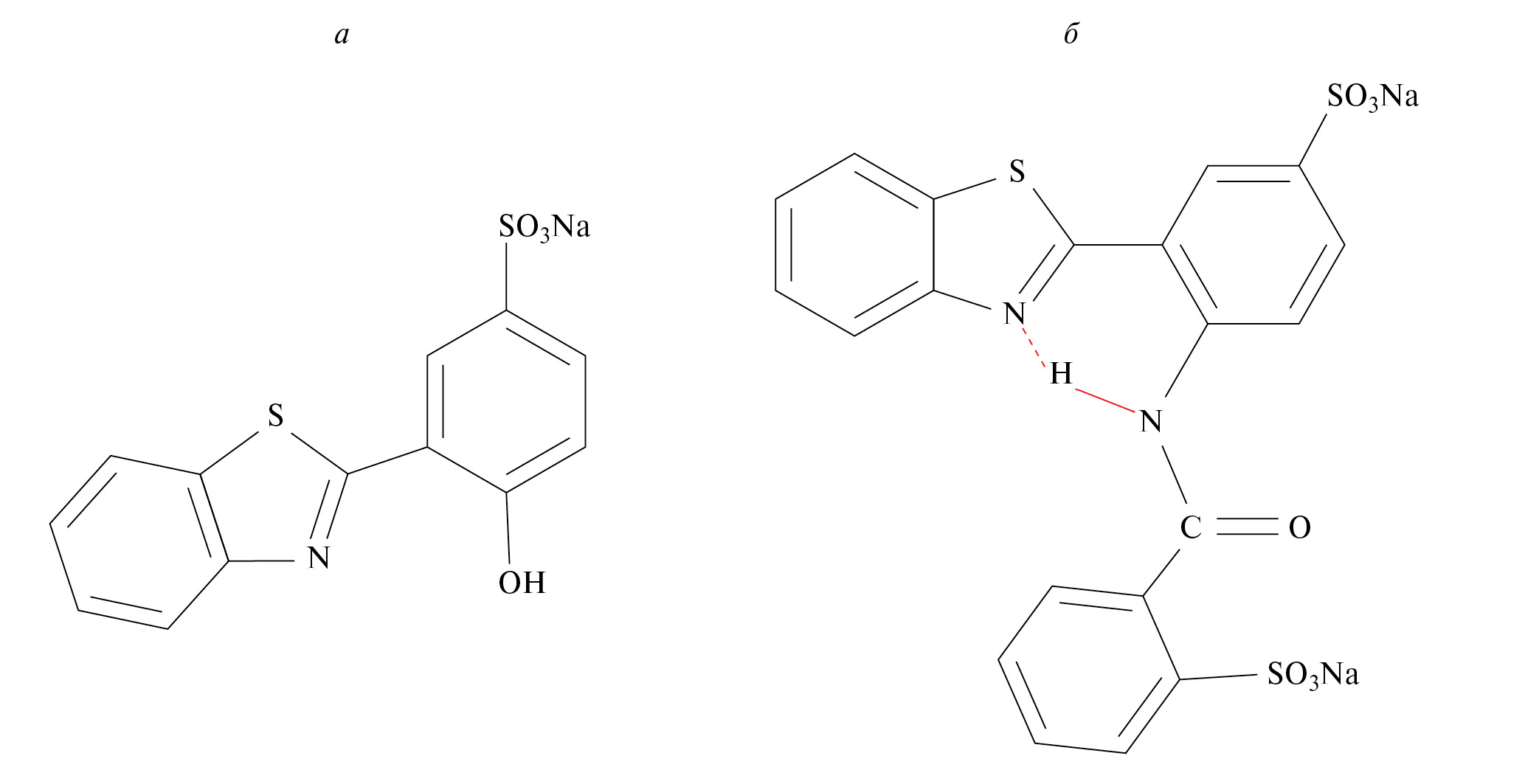 В работе был проведен сравнительный анализ спектральных и фотофизических свойств двух новых водорастворимых бесцветных соединений на основе 3-(1,3-бензотиазол-2-ил)-4-гидроксибензолсульфокислоты, с привлечением экспериментальных методов и квантово-химических расчетов. Эти соединения имеют общую структуру хромофора, один из которых во 2-м положении имеет сульфобензоиламиногруппу вместо гидроксильной группы (рис. 1). Это различие играет принципиальную роль в эффективности протекания внутримолекулярного переноса протона в возбужденном состоянии. Выявление связи структуры вещества с его свойствами способствует реализации направленного химического синтеза люминофоров с заданными характеристиками.