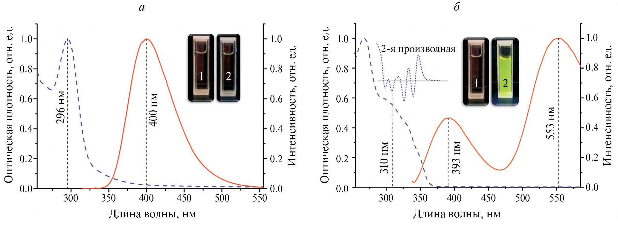 Исследуемые вещества имеют различные спектральные характеристики и не поглощают в видимой области спектра (рис. 2). Для исследования сложной структуры спектров и выделения скрытых полос поглощения был применен метод производной спектрофотометрии [19]. Люминофор 1 имеет одну полосу флуоресценции на 400 нм (рис. 2а), тогда как Люминофор 2 демонстрирует две полосы: с максимумом на 393 и 553 нм (рис. 2б). При этом для длинноволновой полосы наблюдается аномально большой стоксов сдвиг. Значения максимумов спектров поглощения, флуоресценции и стоксовы сдвиги приведены в табл. 1.