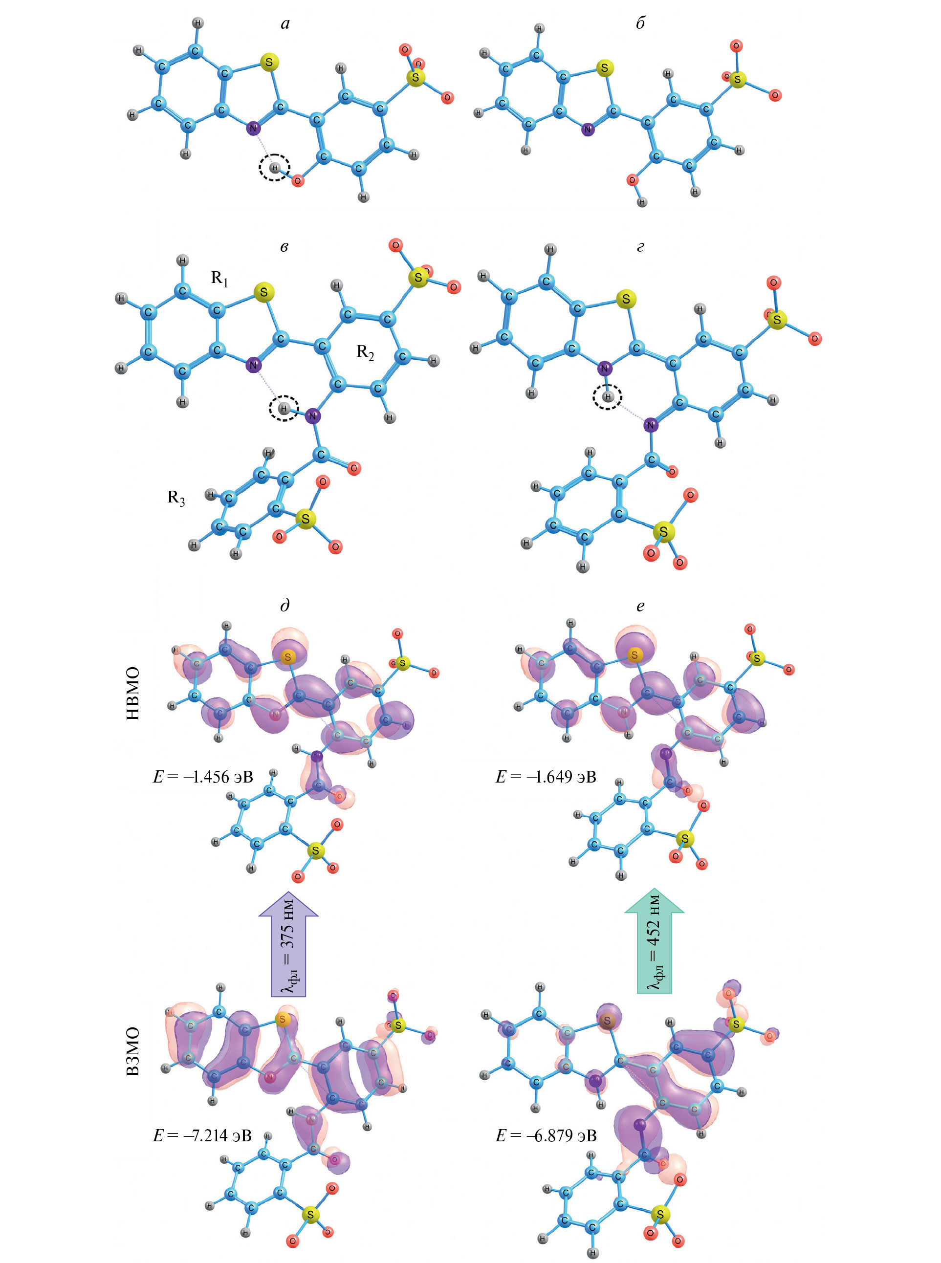 Рис. 4. Атомная структура Люминофора 1 для конформера 1 (а) и конформера 2 (б), пунктирной линией показано взаимодействие с растворителем. Таутомерные формы Люминофора 2: N*-состояние (в) и T*-состояние (г); кругом отмечены фрагменты, содержащие отличия форм; R1, R2, R3 — заместители молекулы; атомы C, O, H, N и S окрашены в синий, красный, серый, фиолетовый и желтый цвета соответственно. Молекулярные орбитали для основного (ВЗМО) и возбужденного (НВМО) состояния таутомеров Люминофора 2: N* — (д), T* — (е)