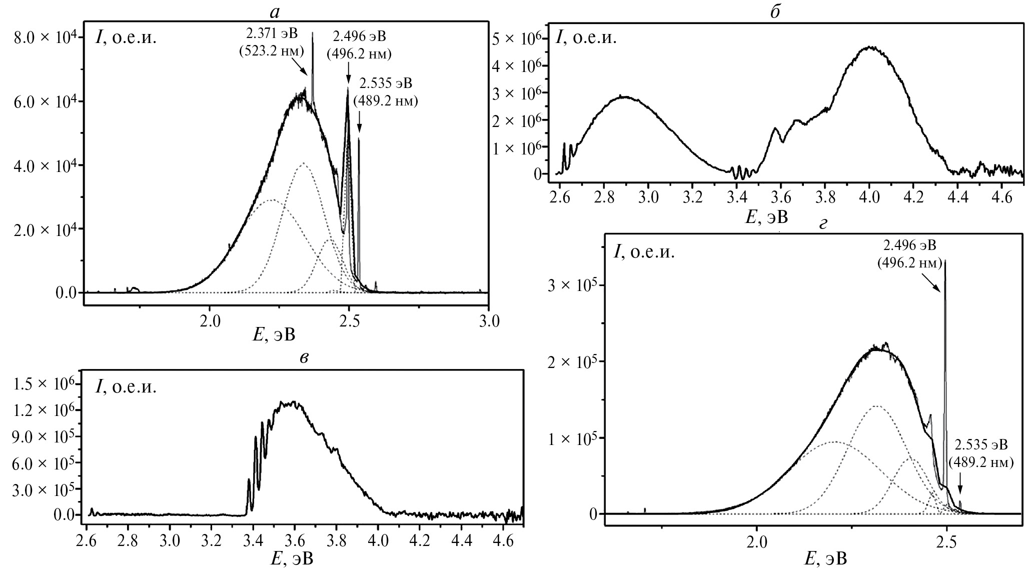 Спектры эмиссии (рис. 1а и 1г) систем S2 и S3 синтетического алмаза соответствуют литературным данным [8, 10]. Спектры возбуждения систем S2 (489.2 нм) и S3 (496.2 нм) демонстрируют различия в их энергетических структурах (рис. 1в и 1б). В спектр возбуждения линии 496 нм вносит вклад также система S2, к которой относятся максимумы 3.381, 3.413, 3.444 и 3.476 эВ (сдвиг 0.032 эВ) в спектре возбуждения. Основной диапазон возбуждения полосы S2 3.4—4 эВ.