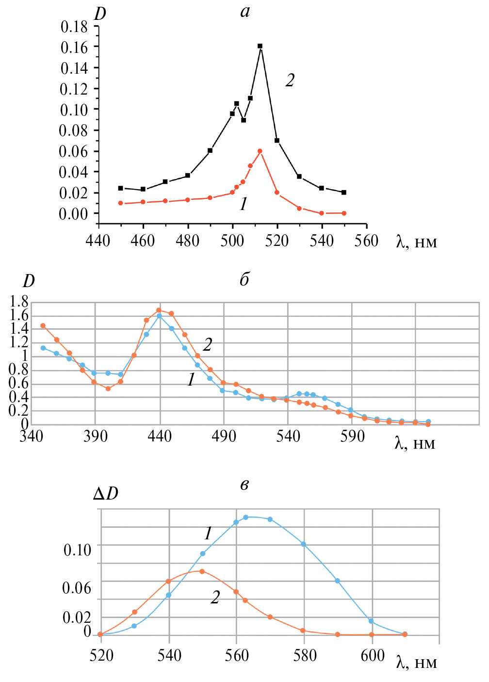 Рис. 1. Спектры поглощения в видимой области спектра кристаллов LiF-UO2 первого (1) и второго типа (2): до облучения (а); после облучения рентгеном в течение 20 мин при КТ (б); разностный спектр, за вычетом М полосы поглощения (в). Толщина первого образца — 3.62; второго — 1.52 мм