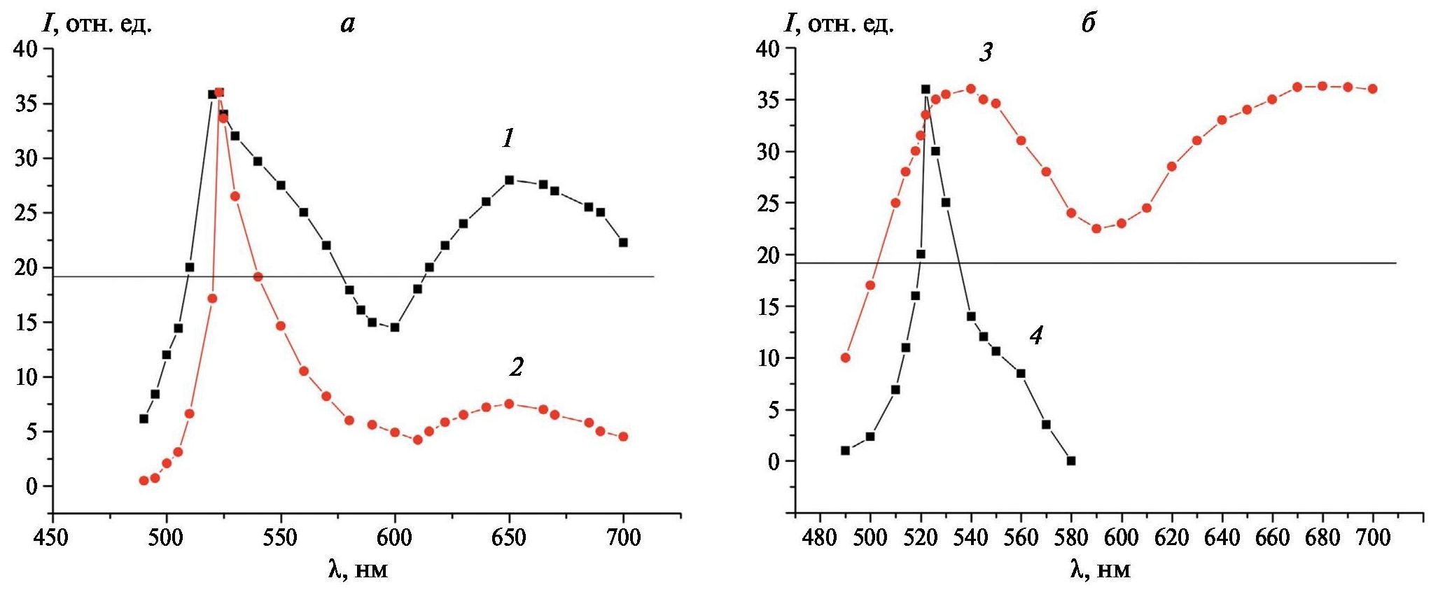 Рис. 2. Спектры фотолюминесценции кристаллов LiF-UO2 первого (1, 3) и второго типа (2, 4): до облучения (4); после облучения рентгеном в течение 20 мин при КТ (1, 2); и дополнительного облучения при пониженной температуре (3)