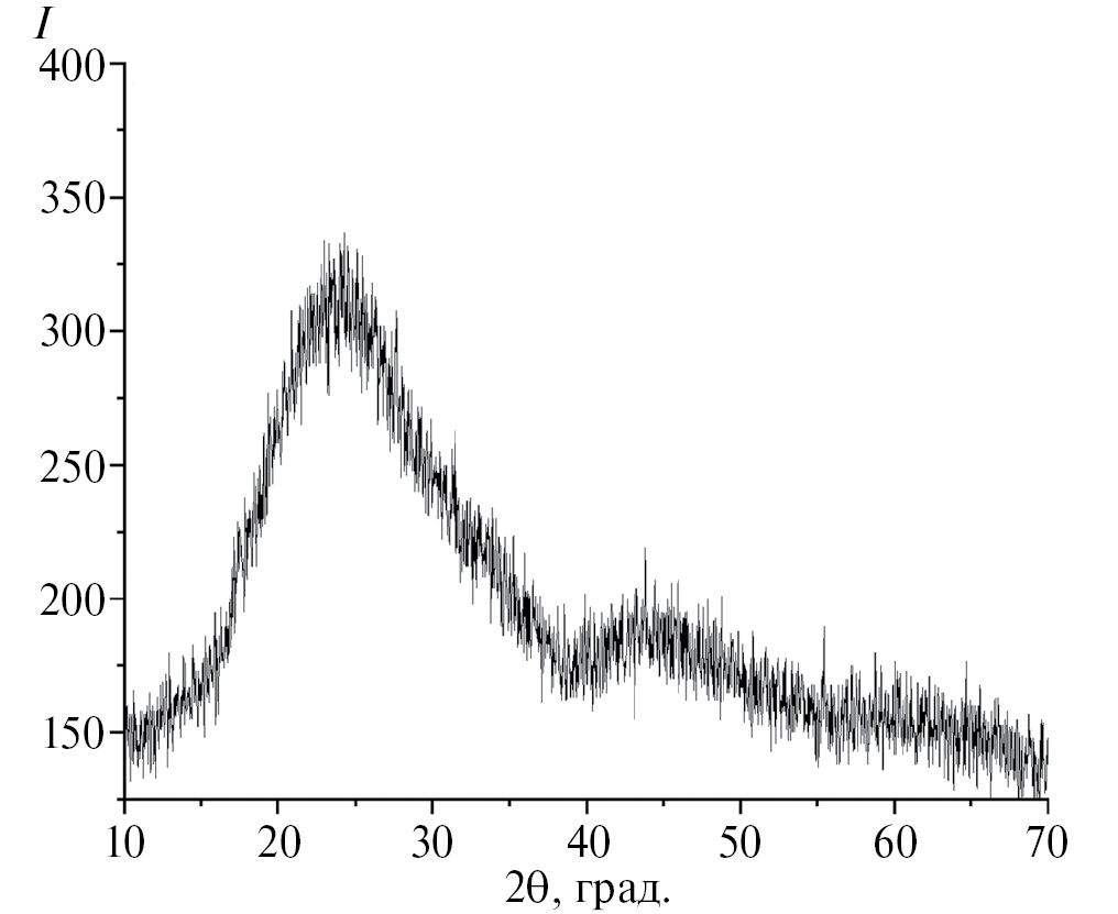 Данные рентгенофазового анализа показали, что все синтезированные стекла являются рентгеноаморфными, без признаков кристаллизации. На рис. 1 представлена рентгенограмма АБС стекла, содопированного ионами Ce и Gd в соотношении 1:3. Для других стекол, исследованных в данной работе, дифрактограммы аналогичны.