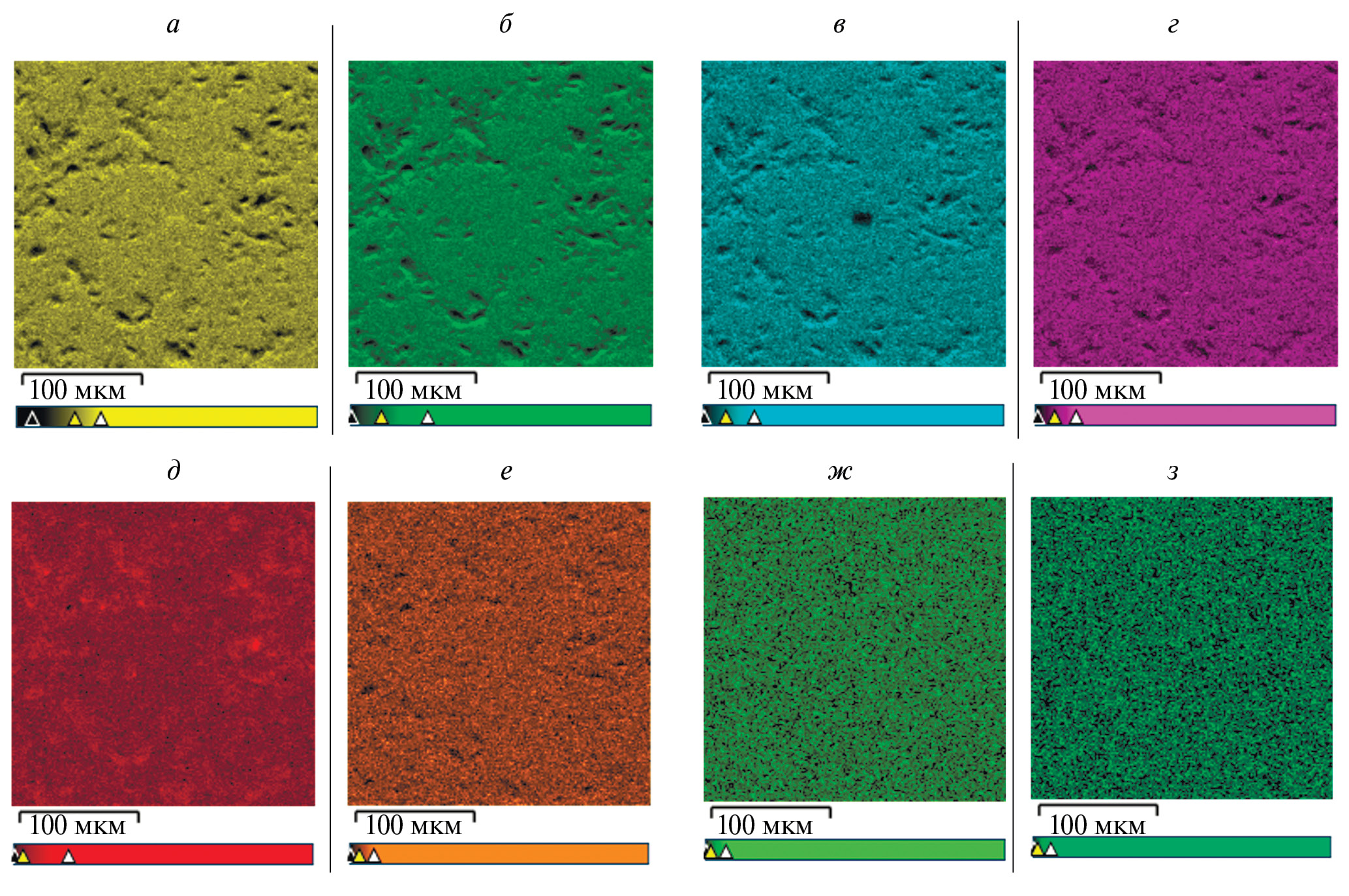 Рис. 2. Распределение элементов в Ce, Gd-содопированном АБС стекле (25Gd/75Ce) по данным сканирующей электронной микроскопии в режиме картирования: (а) Si Kα1, (б) O Kα1, (в) Na Kα1,2, (г) Al Kα1, (д) C Kα1,2, (е) Zr Lα1, (ж) Ce Lα1, (з) Gd Lα1.