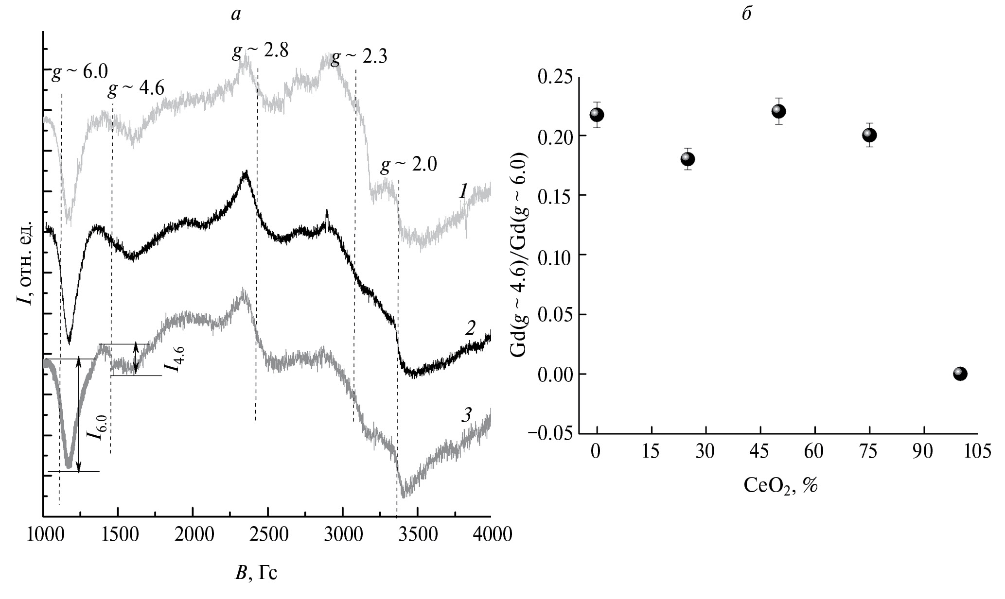 Рис. 4. Спектры ЭПР содопированных АБС стекол (1 — 25Gd/75Ce, 2 — 50Ce/50Gd, 3 — 75Gd/25Ce) в зависимости от соотношения РЗ содопантов (а). Соотношение высокосимметричных Gd3+-положений в АБС стекле как функция соотношения концентраций содопантов (CeO2/CeO2+Gd2O3) (б).