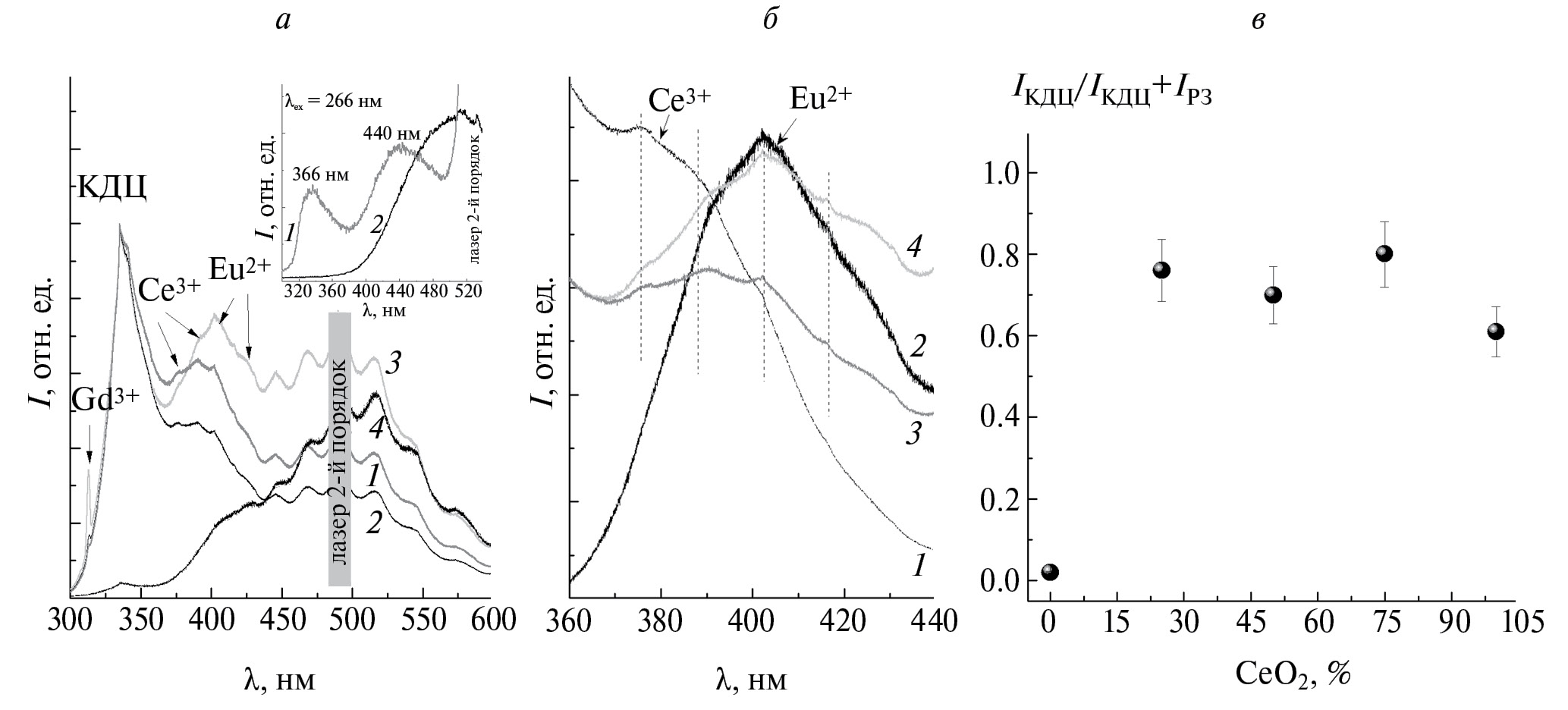 Рис. 5. Спектры люминесценции содопированных (1 — 25Gd/75Ce, 2 — 50Ce/50Gd, 3 — 75Gd/25Ce) и недопированного (4) АБС стекол при возбуждении с λex = 244 нм (Ar+-лазер) (а); на вставке — спектры люминесценции с временным разрешением: 1 — d = 100 нс, G = 50 нс, 2 — d = 150 нс, G = 9 мс, возбуждение λex = 266 нм (Nd: YAG-лазер). Спектры люминесценции Ce- (1) и Eu-монодопированных (2) и содопированных (3 — 25Gd/75Ce и 4 — 75Gd/25Ce) АБС-стекол при возбуждении с λex = 244 нм (Ar+-лазер) (б). Интенсивность люминесценции КДЦ в АБС-стекле как функция соотношения концентраций содопантов (CeO2/CeO2+Gd2O3) (в).