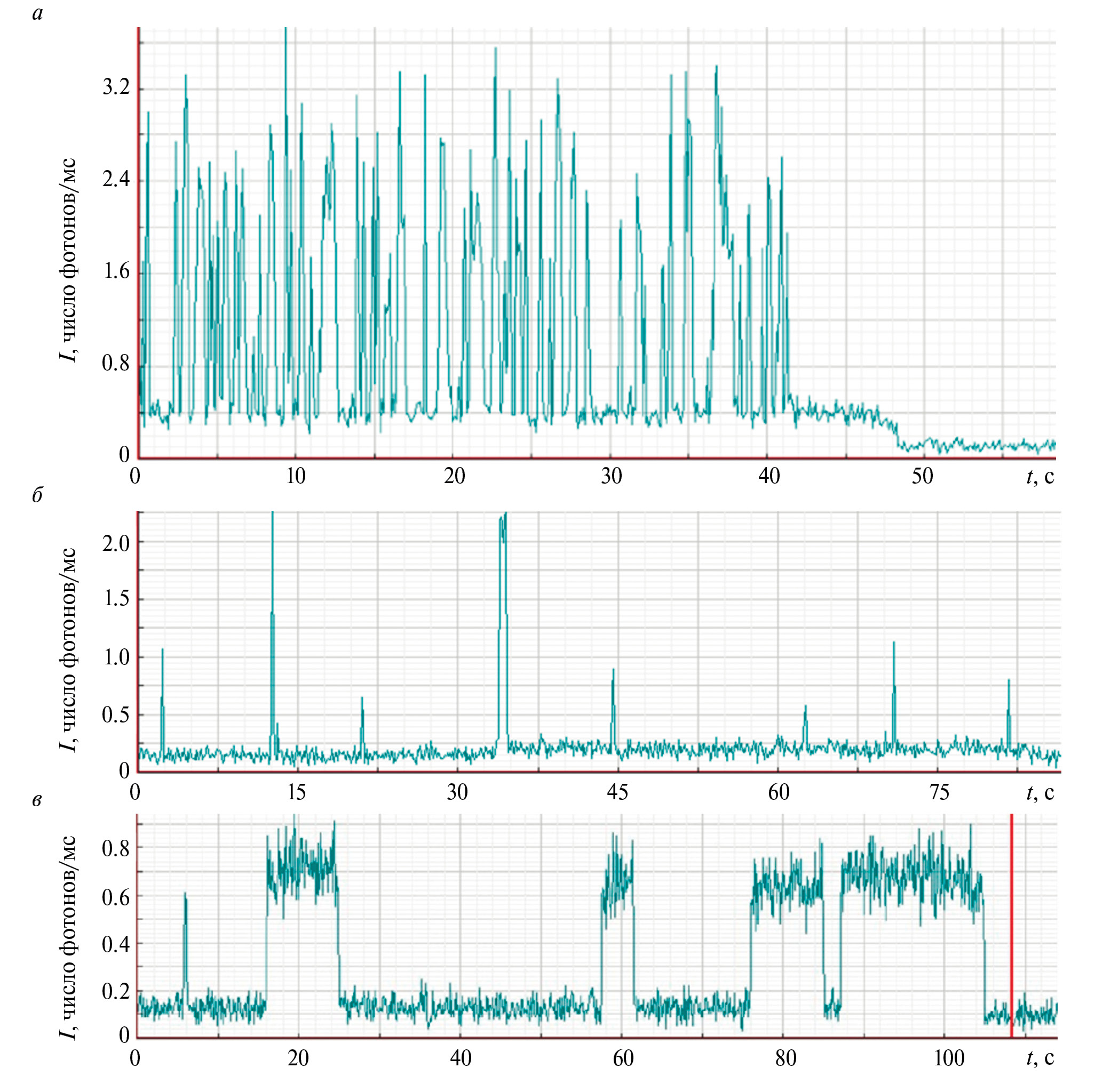 Рис. 2. Квантовые траектории интенсивности люминесценции одиночных: (а) F3+-центра, (б) центра первого типа, (в) центра второго типа.