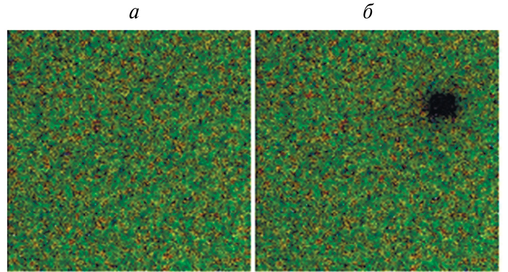 Рис. 4. Сканированная фотография центров окраски в NaF: (а) до выжигания и (б) после 15 минут выжигания, размер изображения 80×80 мкм.