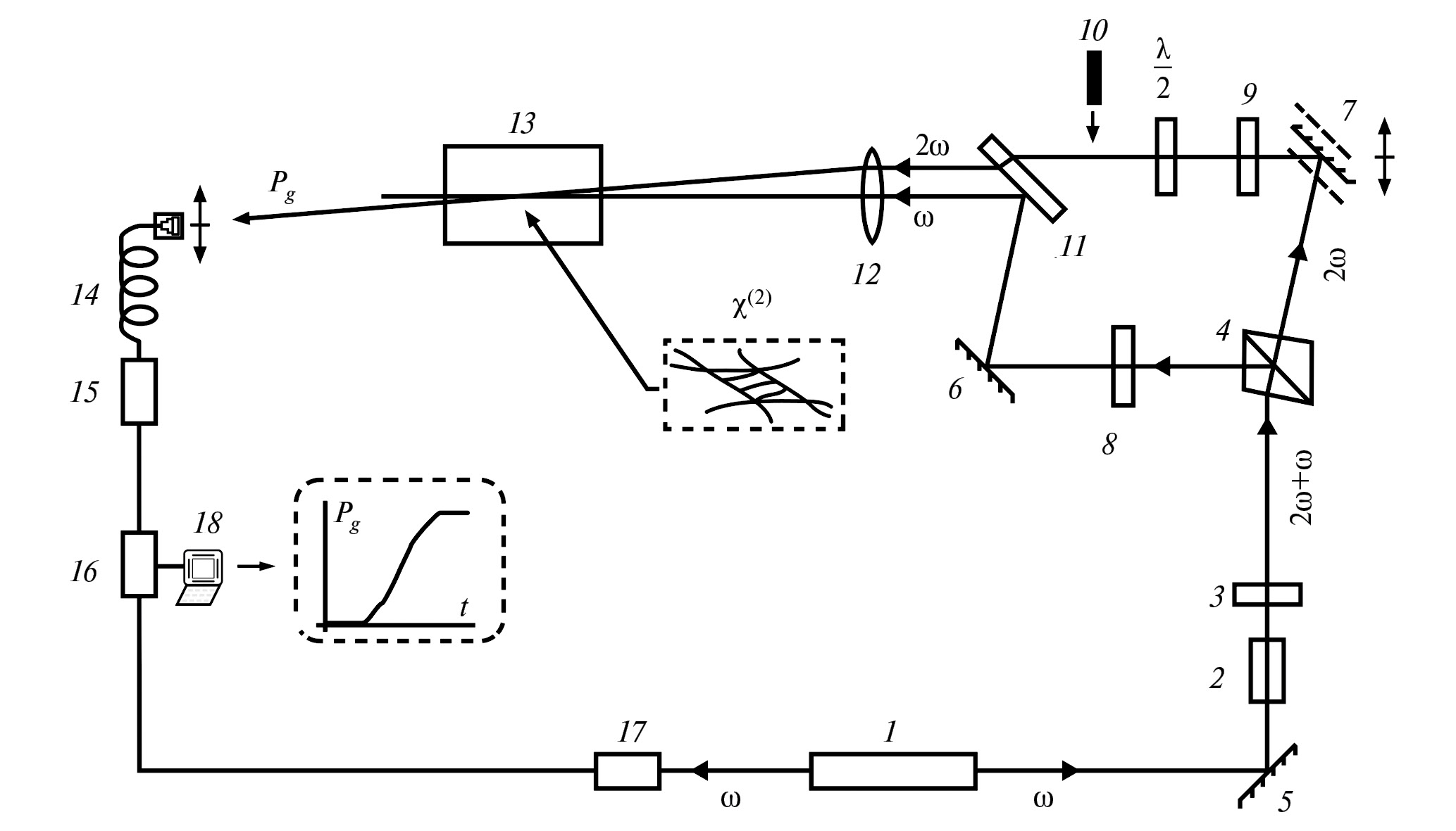 Рис. 1. Схема экспериментальной установки: 1 — YAG: Nd3+-лазер, 2 — преобразователь во вторую гармонику на основе кристалла КТР, 3 — фазовращающая пластинка, 4 — призма Глана со скошенными гранями, 5—7 — зеркала, 8, 9 — фильтры для излучений основной и удвоенной частот, 10 — шторка, 11 — поляризационный элемент, 12 — линза, 13 — образец, 14 — световод, 15 — фотоэлектронный умножитель, 16 — строб-преобразователь напряжения, 17 — фотодиод, 18 — компьютер.