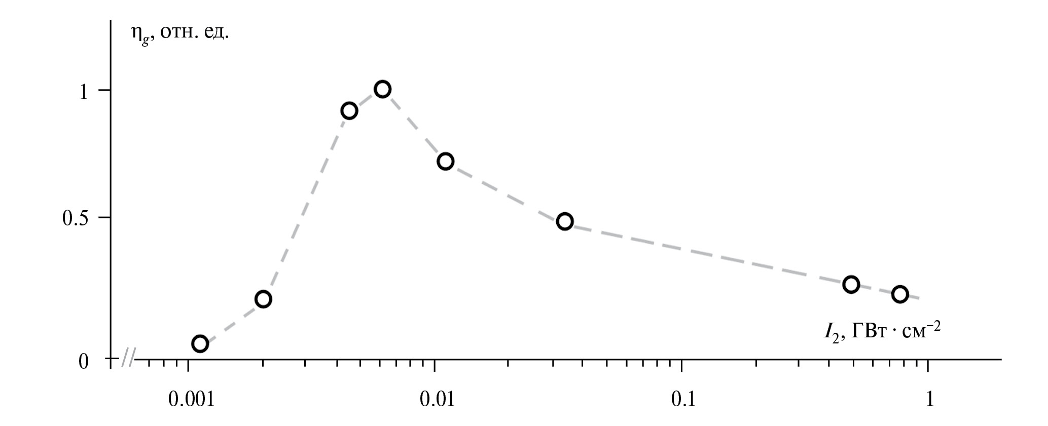 Заметим, что строго возрастающей зависимости эффективности ГВГ при увеличении интенсивностей полингующих изучений не наблюдается. Так, при меньших интенсивностях может обнаружиться, наоборот, более большая эффективность ГВГ (табл. 1). Очевидно, что подобное поведение обусловлено какими-то изменениями в микроскопических процессах, происходящими при объемном ОП среды. К примеру, при увеличении интенсивности полингующих излучений в образце может возникнуть достаточно сильная фотопроводимость, влияющая на процесс формирования решетки электрического поля (2) при объемном ОП. Для проверки данного факта в выбранном германо-силикатном стекле нами было проведено отдельное исследование зависимости эффективности ГВГ от разных интенсивностей компоненты полингующего излучения с длиной волны λ = 532 нм. Результаты этого эксперимента показаны на рис. 2.