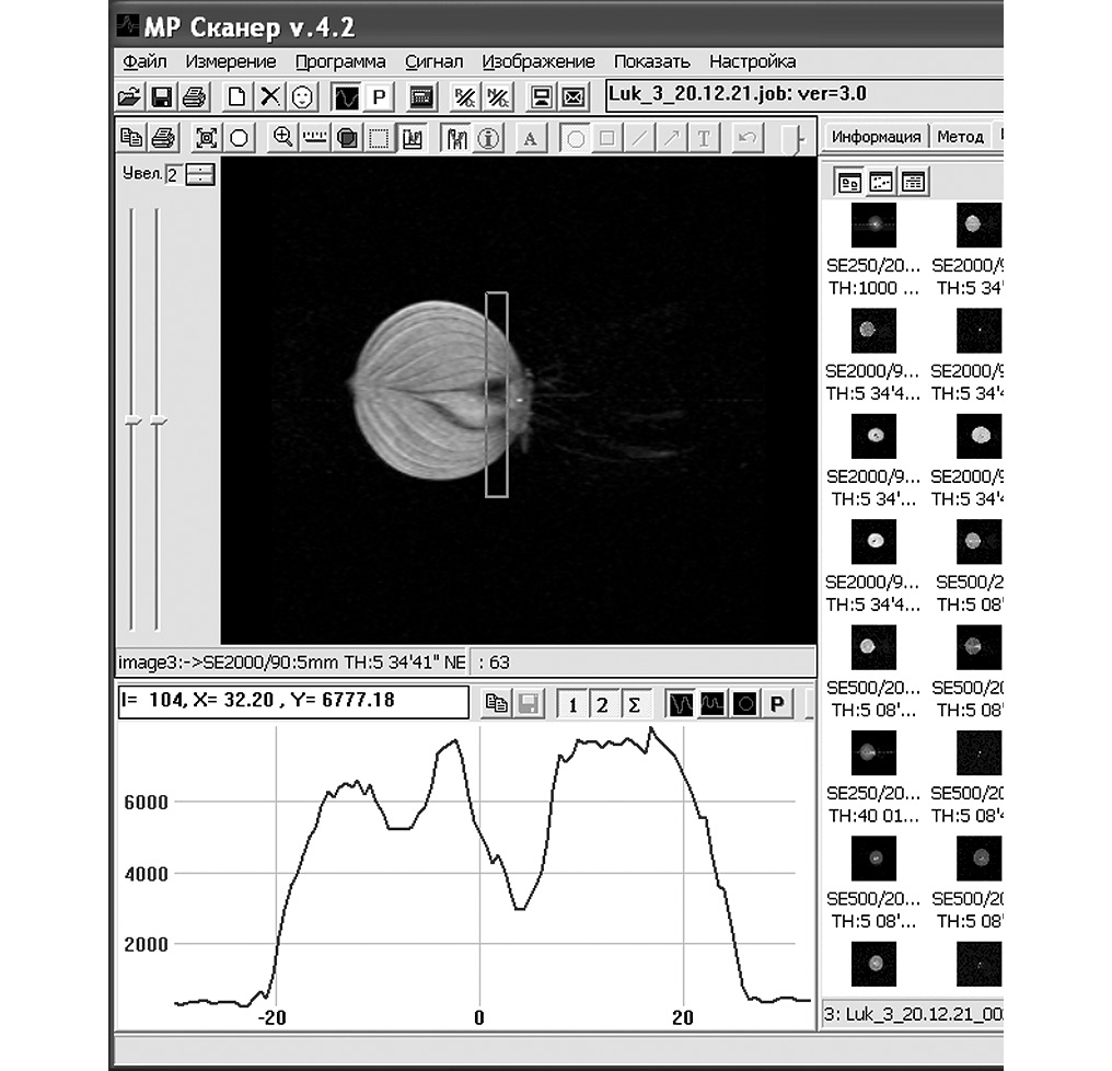 На рис. 3 представлен общий вид окна сканирования с изображением среза луковицы репчатого лука, полученным на МР-томографе. В прямоугольной области производится вычисление яркости элементов изображения. График распределения яркости вдоль выделенного прямоугольника изображен в нижней части окна сканирования. Анализ соотношения яркости открытых и закрытых сочных чешуй позволяет получить информацию, например о лежкости лука. При анализе серии изображений выполняется построение семейства графиков по одному контуру, что позволяет изучить динамику изменений яркости структуры объекта в эксперименте.