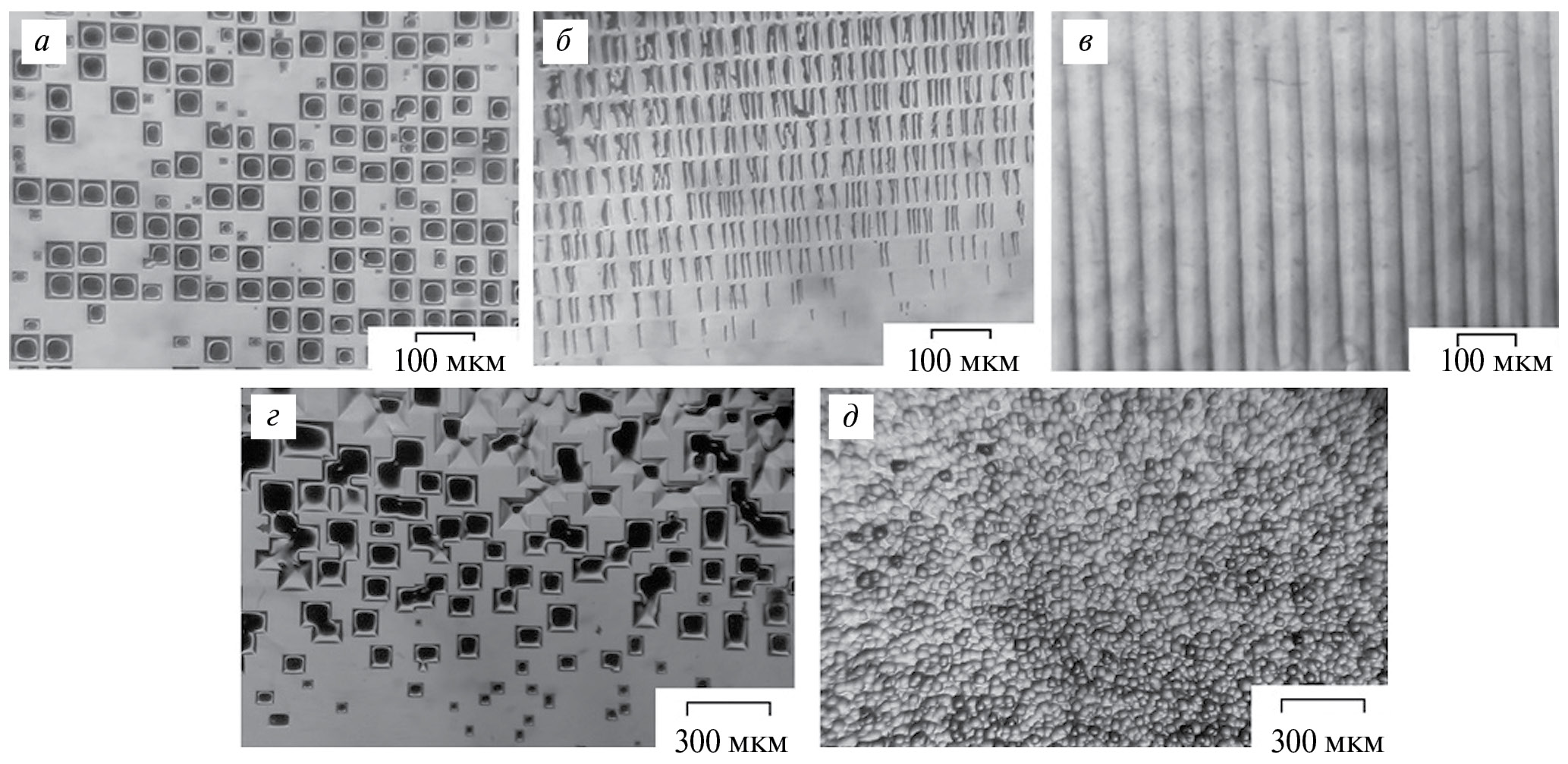 Рис. 1. Фотографии поверхности кремния КДБ-1 (111), имплантированного ионами фосфора P+ с энергией 50 кэВ и дозой 3.12⋅1015 см−2 через металлическую сетку периодом 40 мкм, после импульсного светового отжига на УОЛ.П-1 с плотностями мощности 60 (а), 240 (б), 900 Вт⋅см−2 (в) и длительностями 3.5 (а), 750 (б) и 120 мс (в) соответственно. Фотографии неимплантированного кремния КДБ-1 (100) после импульсного светового отжига на УОЛ.П-1 с плотностью мощности 1200 Вт⋅см−2 и длительностями 70 (г) и 90 мс (д) (поверхность до отжига шлифовалась).