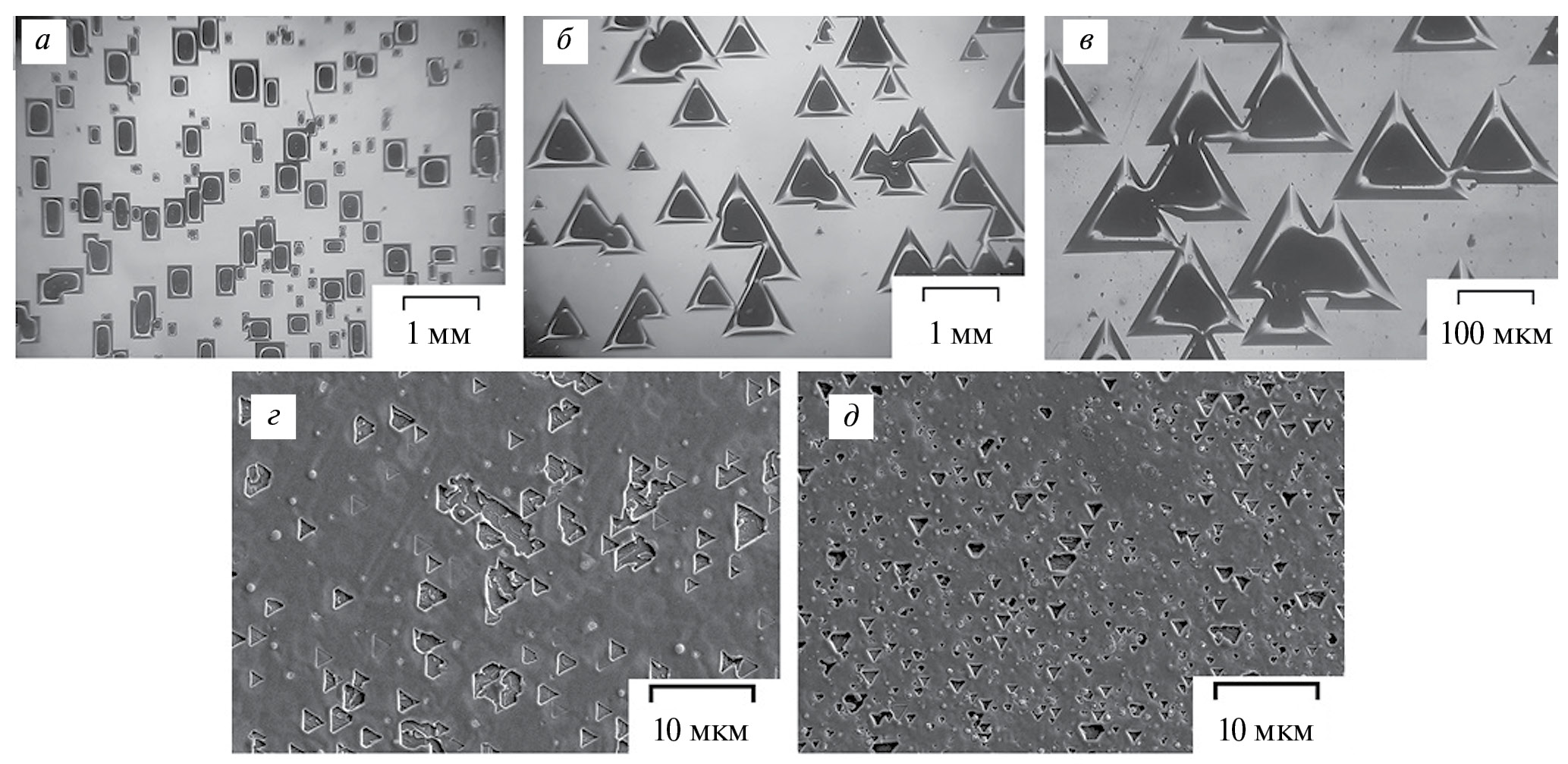 СЭМ-изображения поверхностей на германиевых подложках, сформированных при импульсном световом облучении по второму способу приведены на рис. 2г, 2д. Как и в случае подложек кремния, на поверхности германия образуются достаточно равномерно распределенные треугольные ямки «травления» или вспученностей. Однако поперечный размер этих образований в случае германия не превышет примерно 1 мкм для длительности импульса 6 с (рис. 2д), что оказывается, как минимум, на порядок меньше размера структур на пластинах кремния. Если исходить из результатов современных экспериментальных работ, данные структурные образования опледеляются механизмами образования локальных областей плаления [12]. Тогда наблюдаемые отличия в формировании микронных и милимметровых структур в германии и кремнии можно связывать с различной температурой плавления данных полупрводников и с различной кинетикой образования и отжига дефектов при имплантации и импульсных световых обработках.