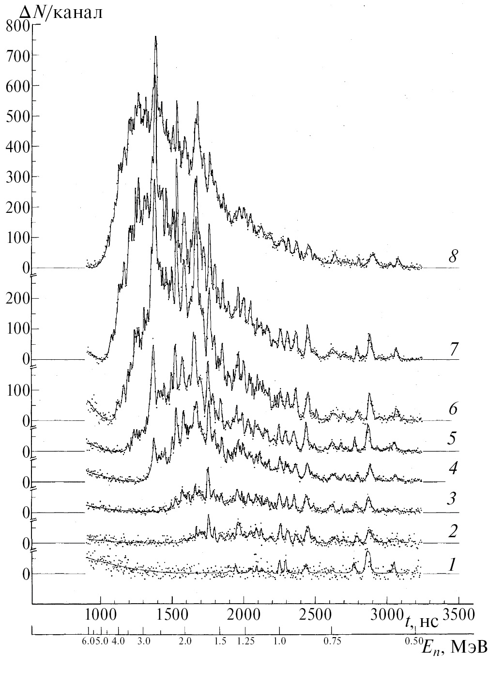 Рис. 2. Спектры нейтронов [4], дающих заселение основных состояний 207Pb для реакции 208Pb(γ, ng), в зависимости от времени пролета t и энергии нейтронов En (нелинейная шкала) для различных верхних границах энергий тормозных γ-квантов Eγ макс: 8.8 (1); 9.4 (2); 9.9 (3); 10.4 (4); 10.9 (5); 11.5 (6); 12.0 (7);12.5 (8).