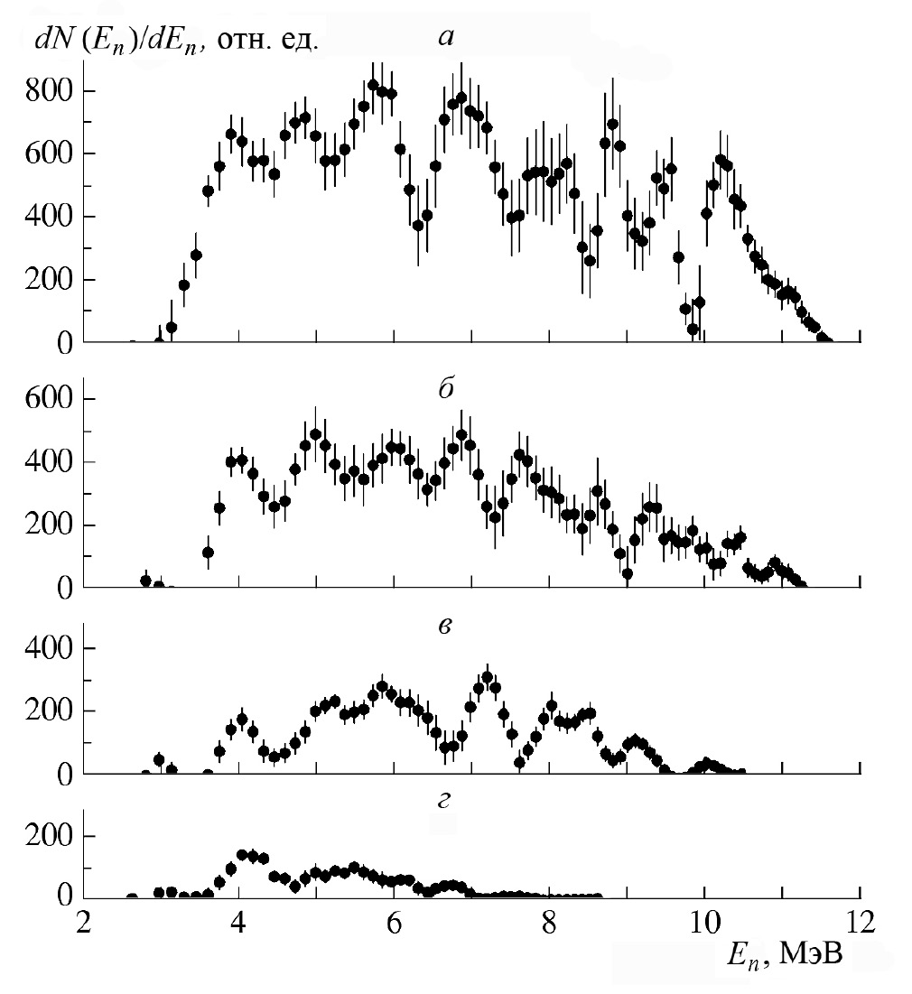 Рис. 4. Спектры нейтронов из реакции 51V(γ, n)50V [3] без рассчитанного по статистической модели «вклада», измеренные при различных верхних границах тормозного спектра Eγ макс: 25.5 (а); 23.0 (б); 21.0 (в); 18.5 МэВ (г).