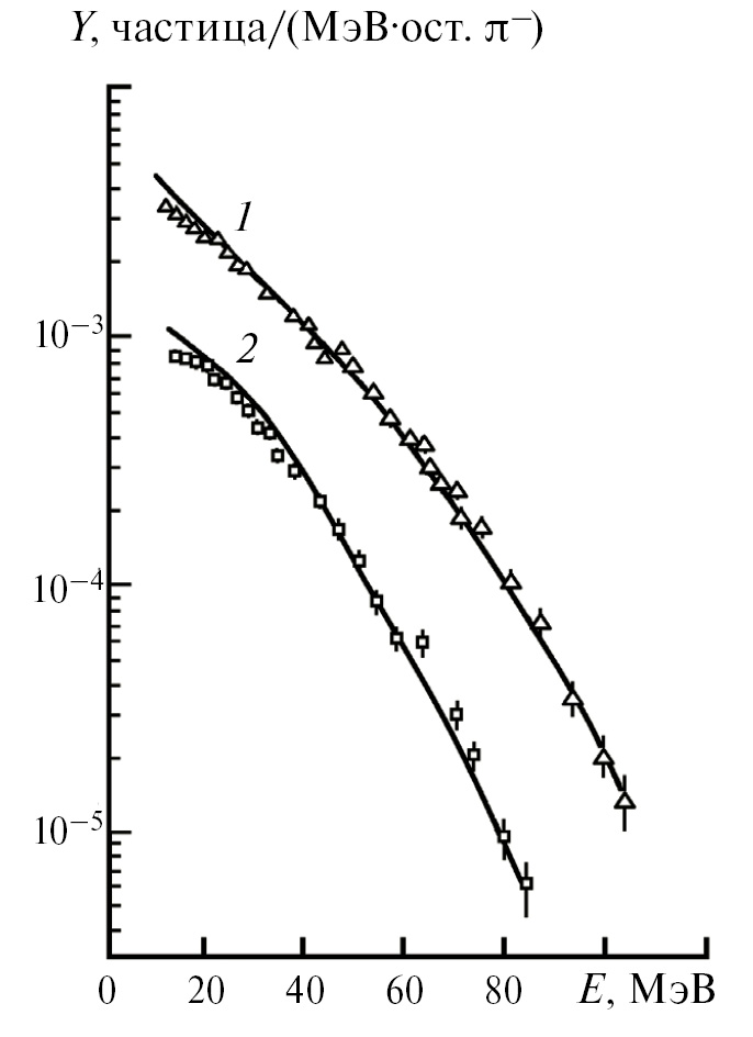 Рис. 1. Энергетические спектры дейтронов и тритонов при поглощении −-мезонов ядрами 28Si. Экспериментальные точки: — дейтроны, — тритоны, сплошные кривые — расчет: 1 — d, 2 — t.