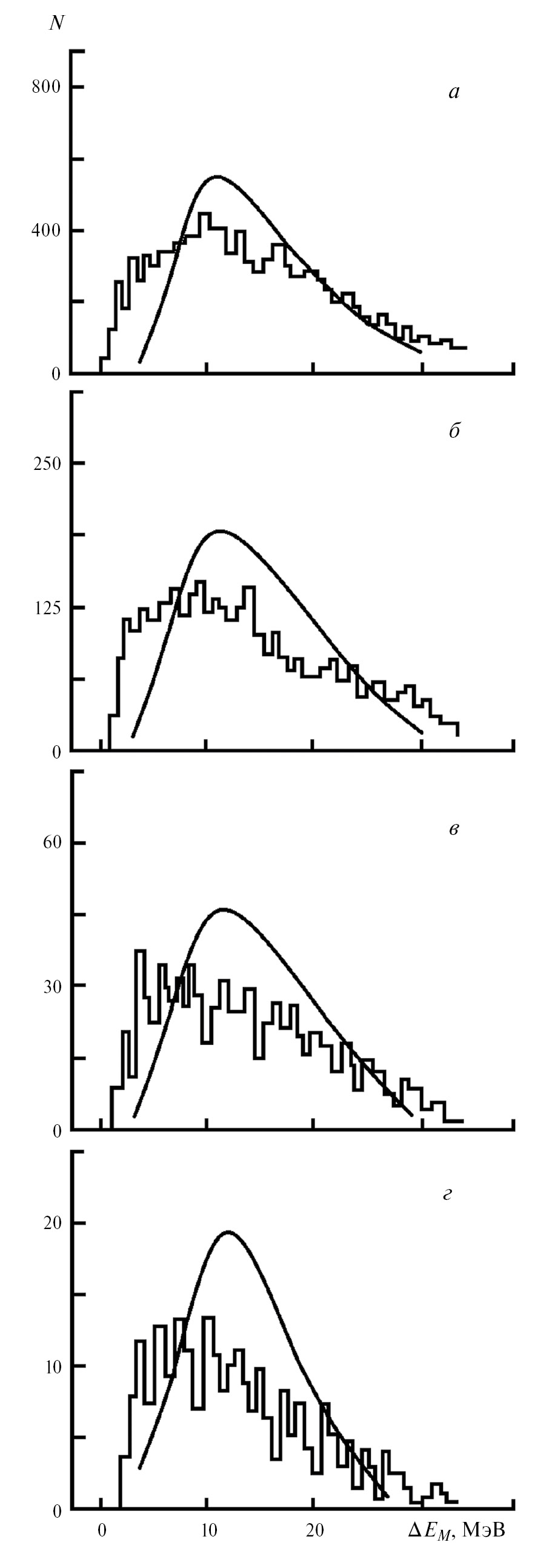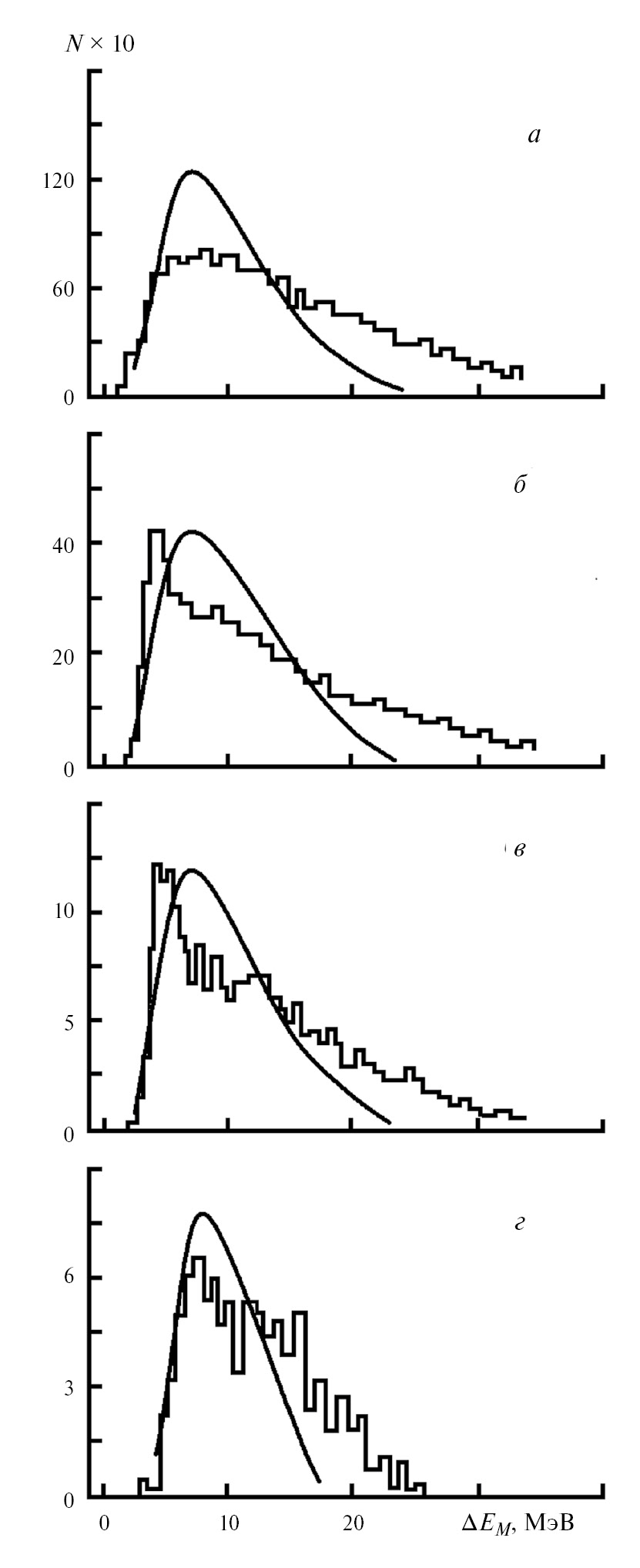 Рис. 2. Экспериментальные и расчетные спектры энерговыделений в “живой” мишени при регистрации дейтронов в энергетических интервалах: а) 10—30; б) 30—50; в) 50—70; г) 70—90 МэВ. Кривые — расчет, гистограммы — результаты эксперимента.